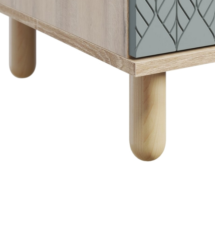 Thùng tủ được sản xuất từ gỗ MDF chống ẩm dày 17mm, phủ melamine vân gỗ giúp hạn chế cong vênh, co ngót. Cánh tủ được sơn hoàn thiện với màu xanh dương nhạt và họa tiết lá nổi chìm mềm mại, vừa tinh tế vừa mang dấu ấn riêng. Hệ thống dán cạnh PVC bằng công nghệ máy hiện đại đảm bảo độ khít, thẩm mỹ và độ bền cao.