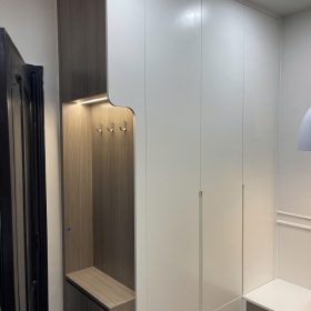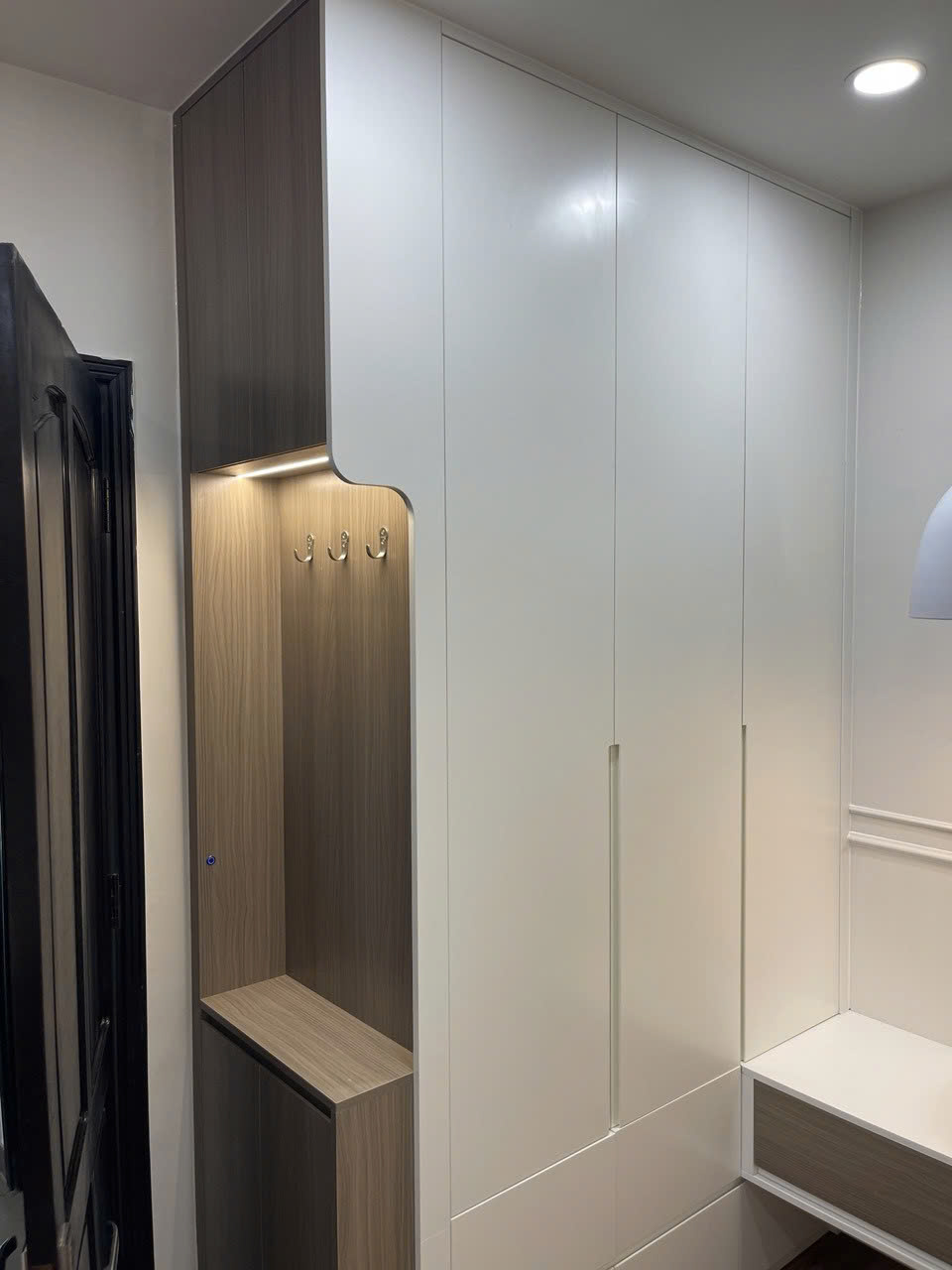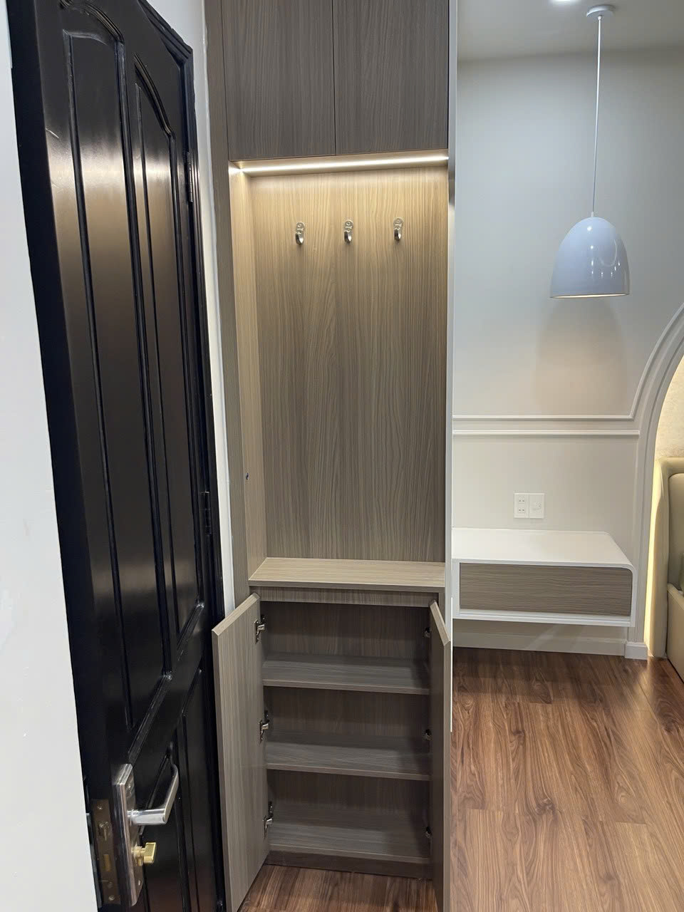 Tủ giày màu cà phê sữa rất đẹp, tone ấm và sang, thi công nhanh gọn đúng hẹn