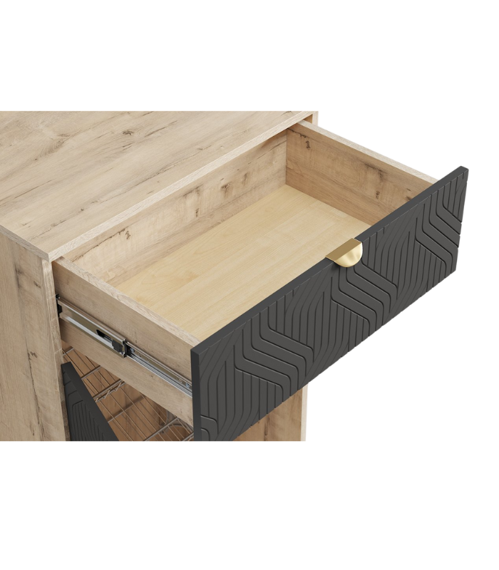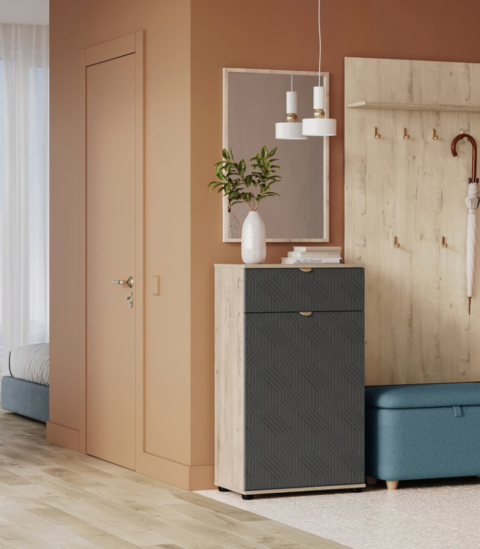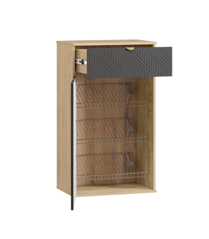 Tông Xám Chì tạo điểm nhấn tinh tế, giúp không gian thêm phần trang nhã. Tủ được thiết kế gồm 1 ngăn kéo phía trên, thuận tiện để lưu trữ phụ kiện nhỏ như chìa khóa, vớ hoặc sản phẩm chăm sóc giày. Phần dưới là 1 cánh mở rộng, bên trong bố trí các thanh để giày thông minh. Hệ kệ giúp giày dép đứng form, hạn chế bám mùi và dễ dàng phân loại. Thiết kế thông thoáng giúp lưu trữ được nhiều đôi giày hơn mà không chiếm diện tích. Các đường nét hoa văn tinh tế ở mặt ngoài mang đến vẻ đẹp đặc trưng của dòng Mont Blanc Fancy.