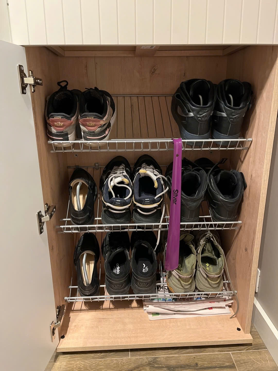 Tủ để được nhiều giày, sắp xếp gọn gàng. Đội thi công đúng giờ, làm việc rất gọn gàng.