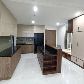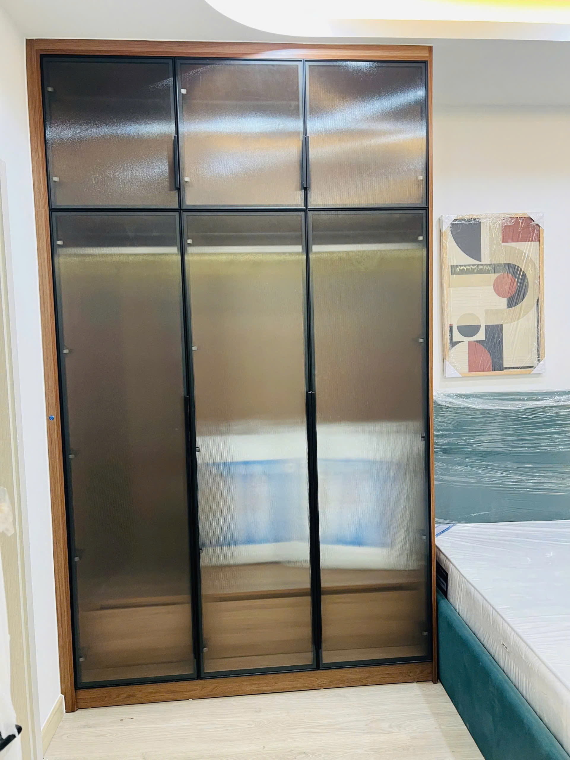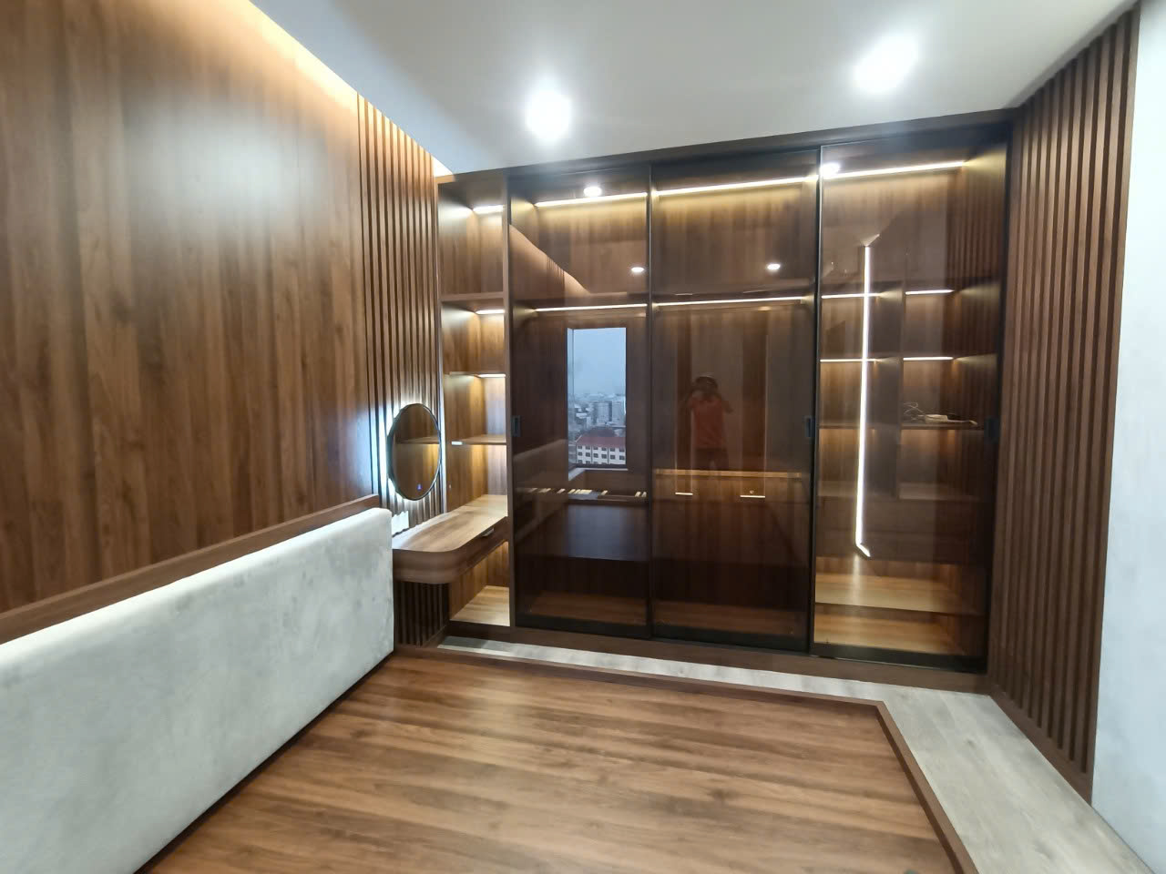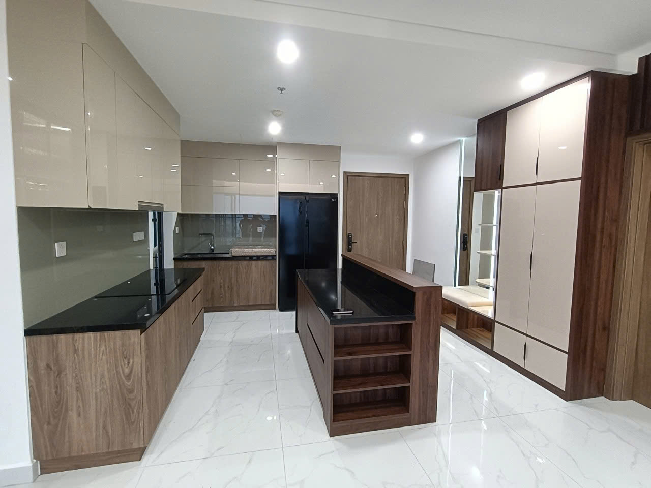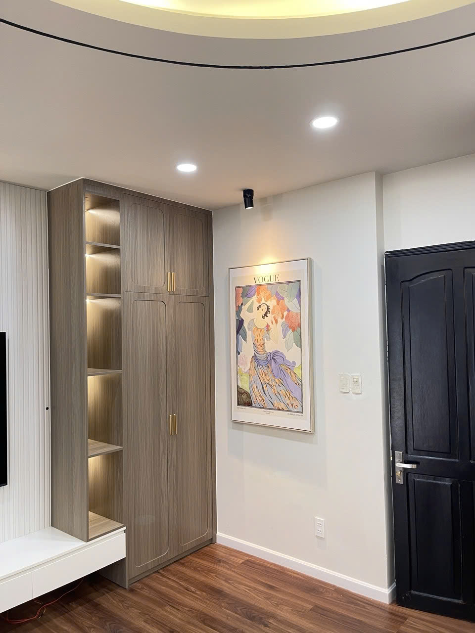Tủ góc hoàn thiện nhanh, màu gỗ sồi nhìn rất sang và sạch.