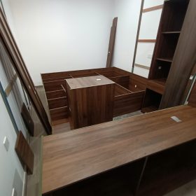Tủ góc hoàn thiện nhanh, màu vân gỗ đẹp và dễ phối nội thất.