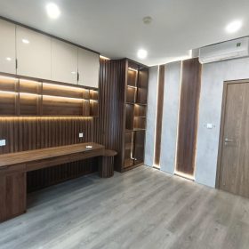 Thiết kế góc chữ L, tối ưu diện tích và dễ dàng kết hợp cùng các món nội thất khác trong phòng. Tông vân gỗ tự nhiên giúp căn phòng trở nên ấm áp, hài hòa và sang trọng hơn.