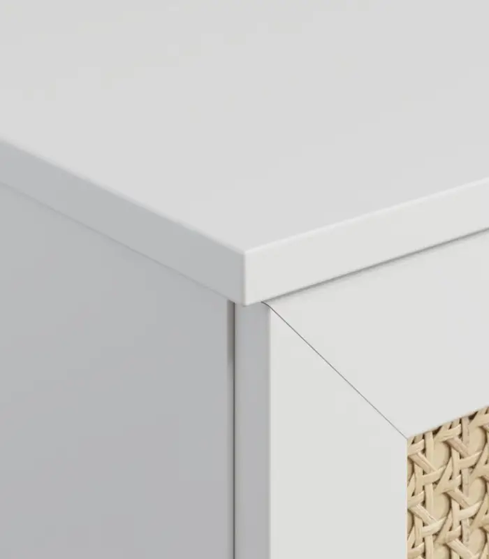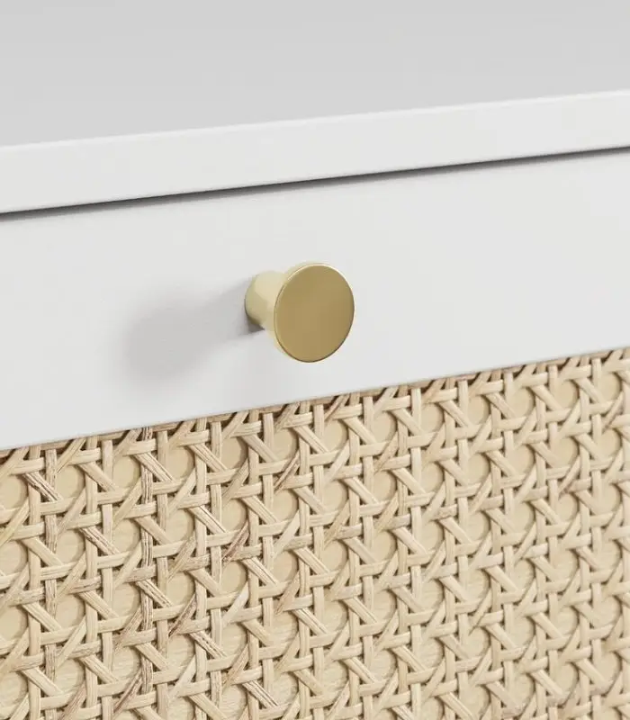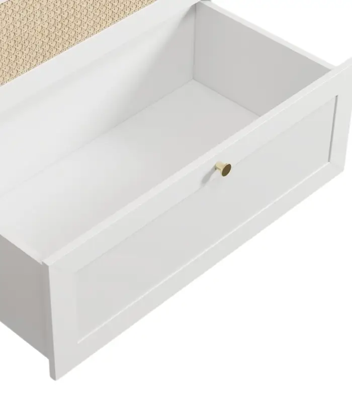 Điểm nhấn đặc trưng của dòng Alvis nằm ở cánh ngăn kéo họa tiết mây sơn một mặt, mang sắc thái tự nhiên và mềm mại, kết hợp hài hòa cùng gam trắng thanh lịch – giúp không gian thêm phần nhẹ nhàng và thoáng đãng.
