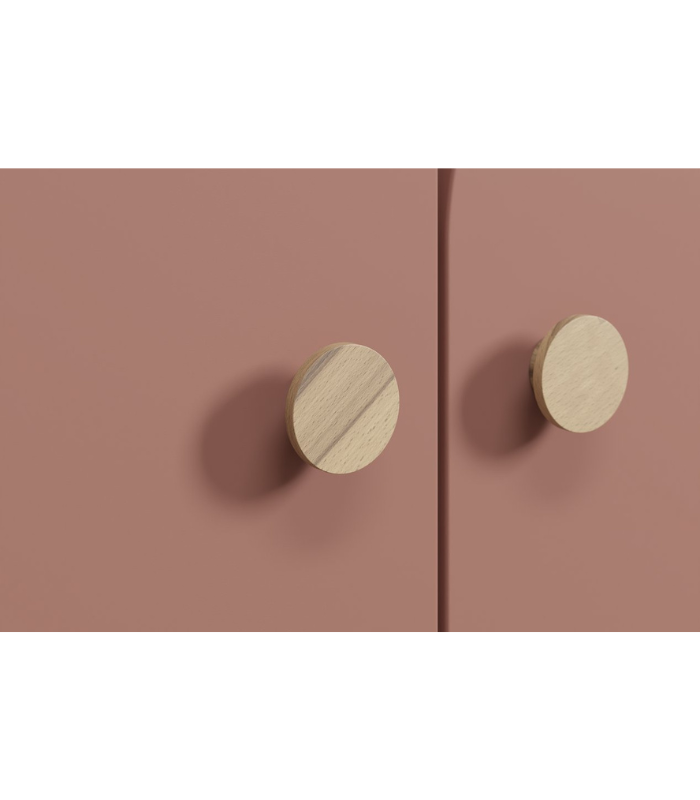 Phần cánh tủ sơn PU 1 mặt có màu hồng Charlie ngọt ngào, kết hợp tinh tế cùng tay nắm dạng nút gỗ tròn, vừa tạo điểm nhấn tự nhiên vừa giúp thao tác mở – đóng dễ dàng. Hai cánh mở nhẹ nhàng, bên trong có không gian rộng rãi để lưu trữ sách, hộp đồ, phụ kiện hoặc vật dụng cá nhân gọn gàng.
