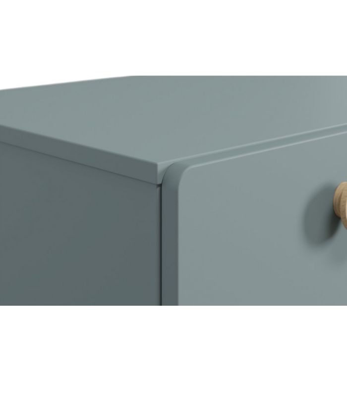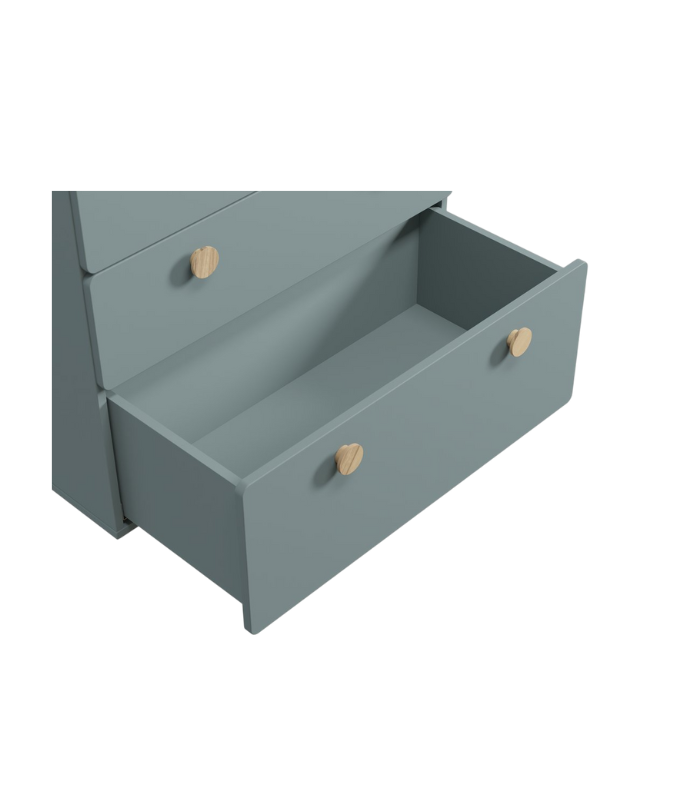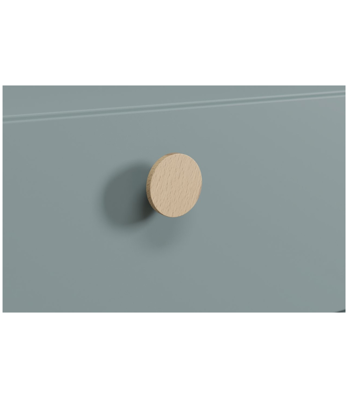 Tay nắm nút tròn bằng gỗ nổi bật trên nền xanh nhạt, mang lại cảm giác hài hòa, tự nhiên và tiện dụng. Các ngăn kéo hoạt động trơn tru, giúp thao tác mở đóng dễ dàng.
