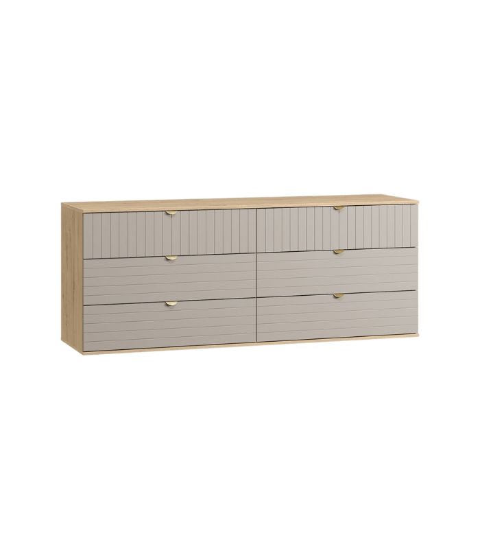 Kích thước 185x50x76 cho phép lưu trữ nhiều đồ đạc mà vẫn đảm bảo sự gọn gàng cho không gian. Tủ được chia thành hai bên, mỗi bên gồm 3 ngăn kéo rộng rãi. Các ngăn kéo trượt nhẹ, giúp người dùng dễ dàng thao tác kể cả khi để đầy đồ. Thiết kế gồm 6 ngăn mang đến khả năng phân loại đồ khoa học, phù hợp cho quần áo, phụ kiện hoặc vật dụng sinh hoạt. Kết cấu chắc chắn đảm bảo độ vững và độ ổn định lâu dài. Mặt ngoài tủ được trang trí hoa văn Line tinh xảo, làm nổi bật tinh thần sang trọng của bộ sưu tập Mont Blanc.