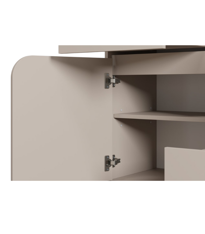 Cánh tủ bo cạnh nhẹ nhàng, an toàn; MDF phủ melamine chống ẩm, bền màu, kết hợp với cánh sơn PU một mặt tạo điểm nhấn sang trọng.