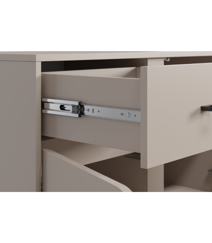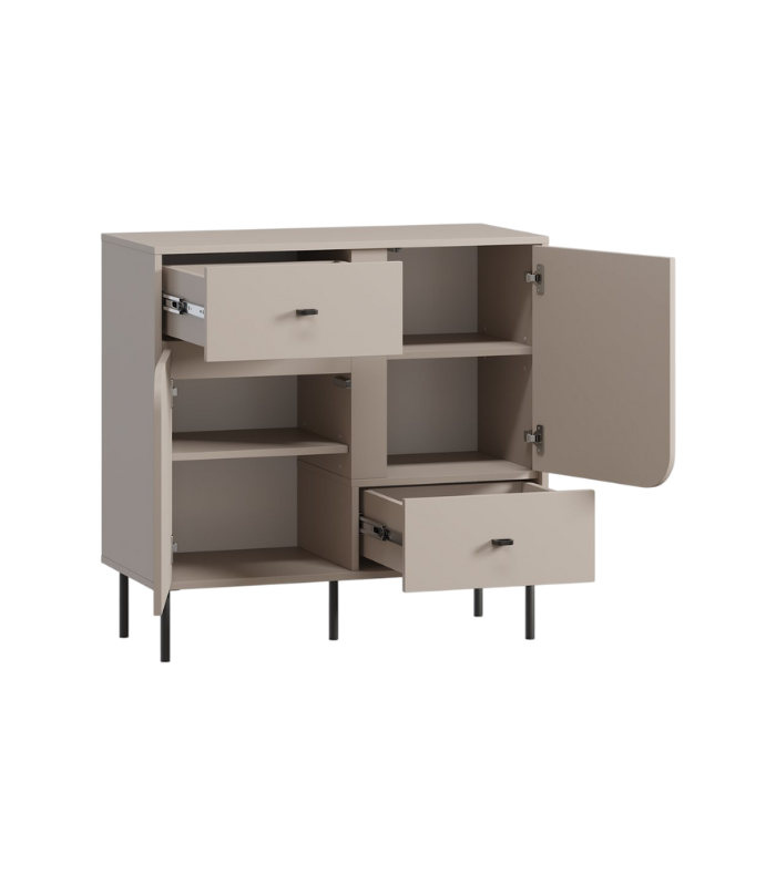 Chân tủ mảnh nhưng vững, giúp tủ đứng chắc chắn và mang lại cảm giác thoáng đãng. Ngăn kéo trượt mượt, tiết kiệm thời gian khi cất hoặc lấy đồ.