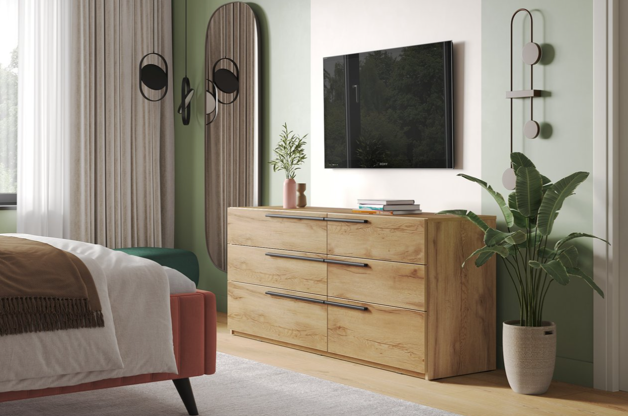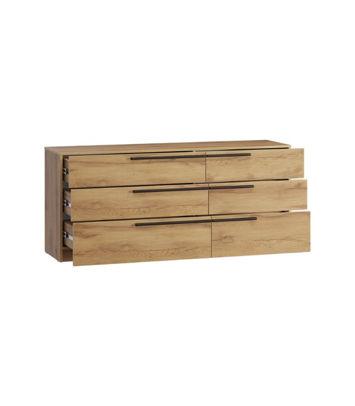 Thiết kế 6 ngăn kéo bố trí đối xứng hai bên, giúp lưu trữ đồ dùng gọn gàng, khoa học và tiện lợi. Gam vân sồi tự nhiên dễ phối cùng mọi phong cách nội thất, từ hiện đại đến Scandinavian, nâng tầm không gian thêm ấm áp và thanh lịch.