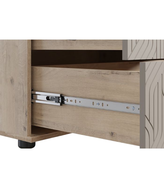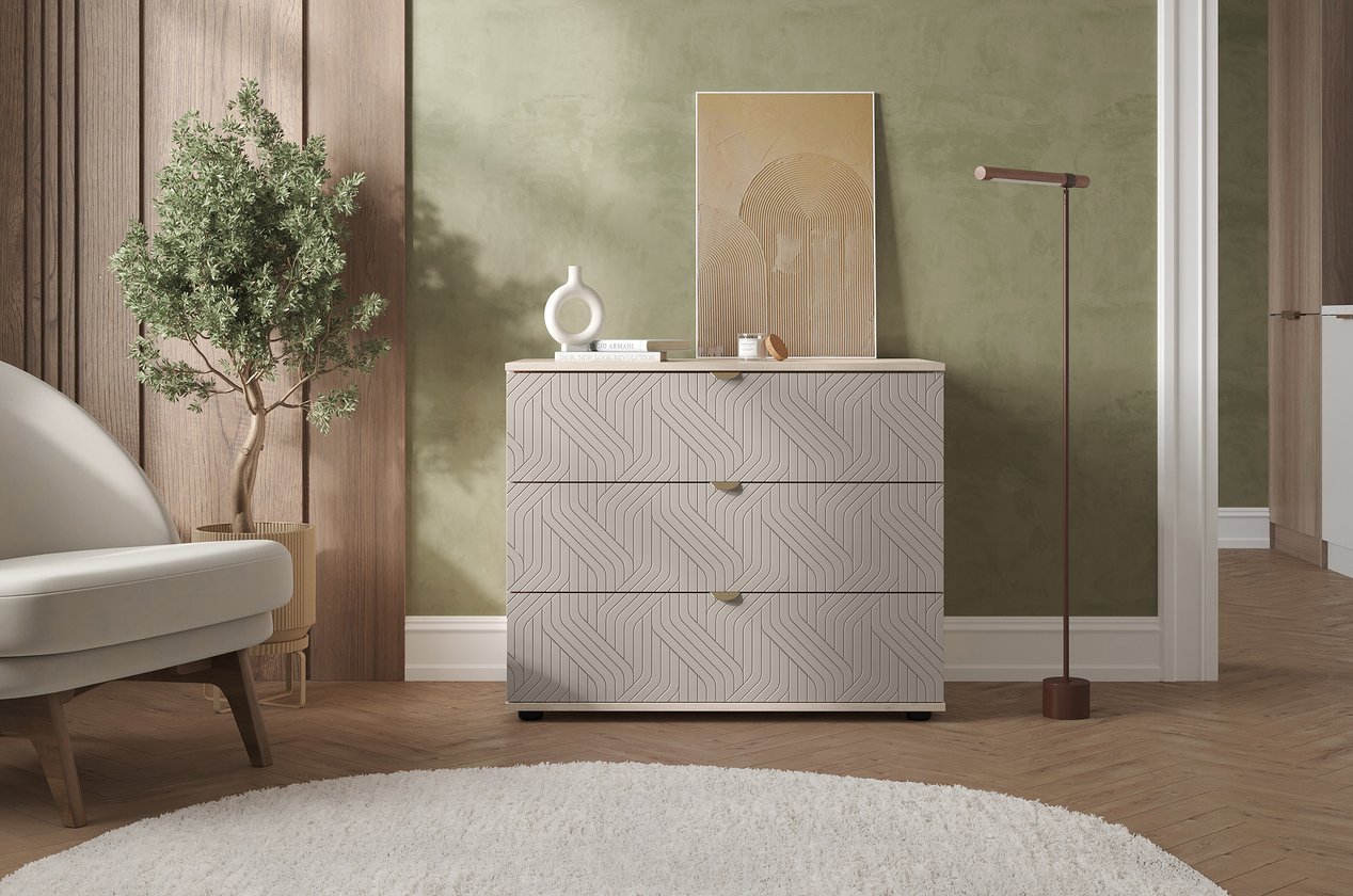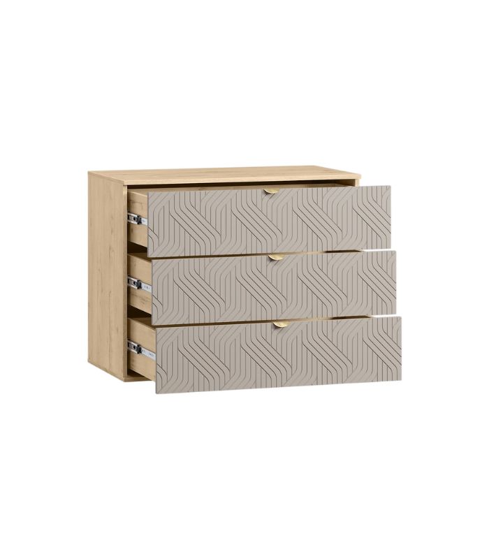 Tủ gồm 3 ngăn kéo giúp tối ưu hóa lưu trữ, từ quần áo gấp gọn đến phụ kiện cá nhân. Hệ ray trượt êm ái giúp thao tác đóng mở dễ dàng. Mặt trước có hoa văn trang trí tinh tế, giúp sản phẩm trở thành điểm nhấn thẩm mỹ nhẹ nhàng nhưng sang trọng. Với tông màu dễ phối, chiếc tủ phù hợp cả phòng ngủ, phòng thay đồ hay phòng khách. Đây là lựa chọn hoàn hảo cho gia chủ yêu thích sự ấm áp, hài hòa và tinh tế trong từng chi tiết nội thất.