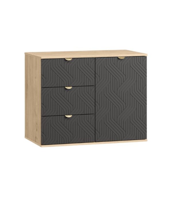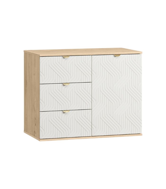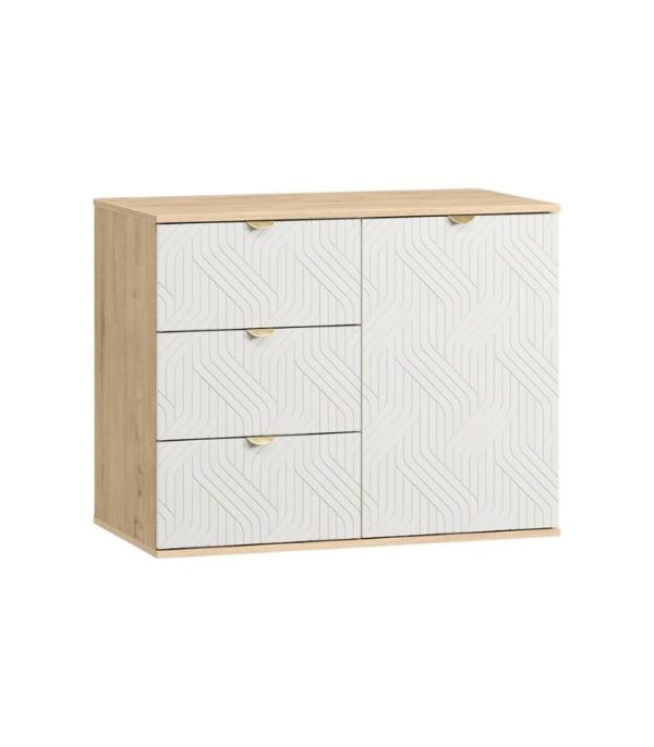 Thiết kế gồm hai phần chính: 3 ngăn kéo bên trái và 1 cánh tủ bên phải. Ba ngăn kéo rộng và sâu cho phép lưu trữ nhiều loại vật dụng từ áo quần, mỹ phẩm, phụ kiện đến tài liệu. Hệ ray kéo mượt mà hỗ trợ thao tác nhẹ nhàng và hạn chế tiếng ồn. Cánh tủ bên phải chia thành 2 ngăn kệ, tối ưu cho các vật dụng lớn hoặc cần phân chia rõ theo nhu cầu. Gam Trắng giúp không gian trở nên sáng, sạch và tạo cảm giác diện tích rộng hơn. Tủ mang phong cách tối giản nhưng vẫn toát lên vẻ tinh tế nhờ hoa văn trang trí Mont Blanc ở mặt trước.