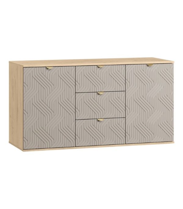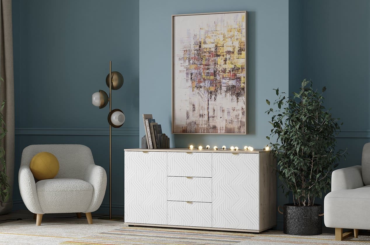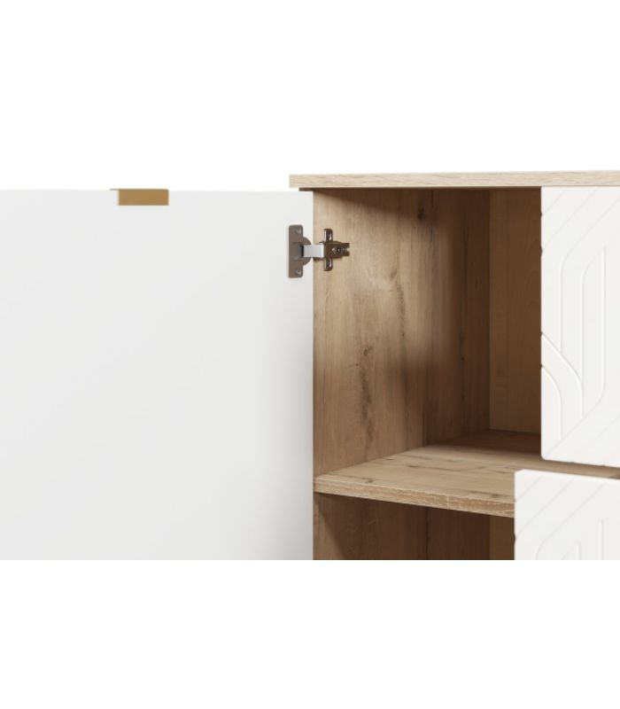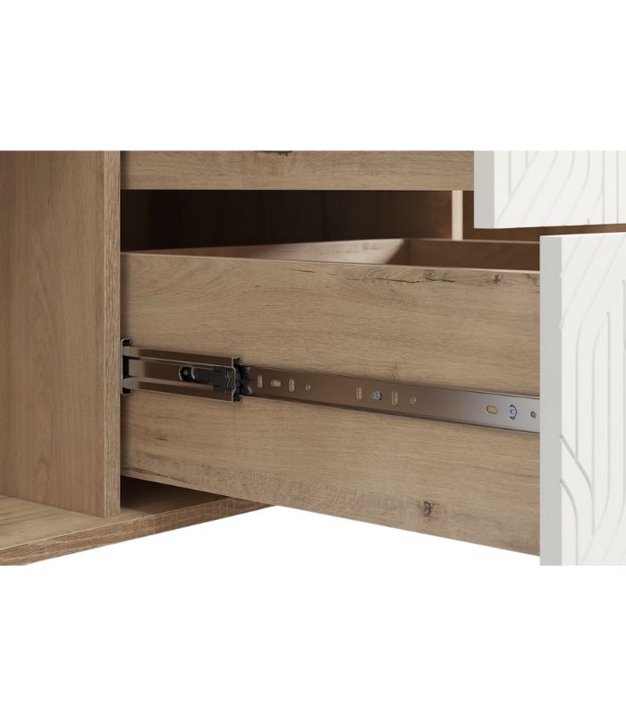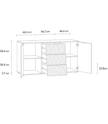 Thiết kế gồm 2 cánh hai bên, bên trong chia thành 2 ngăn kệ để tối ưu hóa việc cất giữ đồ lớn hoặc vật dụng trang trí. Ở giữa tủ là 3 ngăn kéo rộng rãi, cho phép phân loại đồ dùng cá nhân một cách ngăn nắp và khoa học. Ray kéo vận hành êm ái, tăng trải nghiệm sử dụng hàng ngày. Mặt trước tủ nổi bật với hoa văn Mont Blanc tinh tế, tạo điểm nhấn sang trọng dù thiết kế tổng thể khá tối giản. Màu Trắng giúp không gian trở nên sáng và rộng hơn, đặc biệt phù hợp với phong cách Scandinavian hoặc Minimalism.