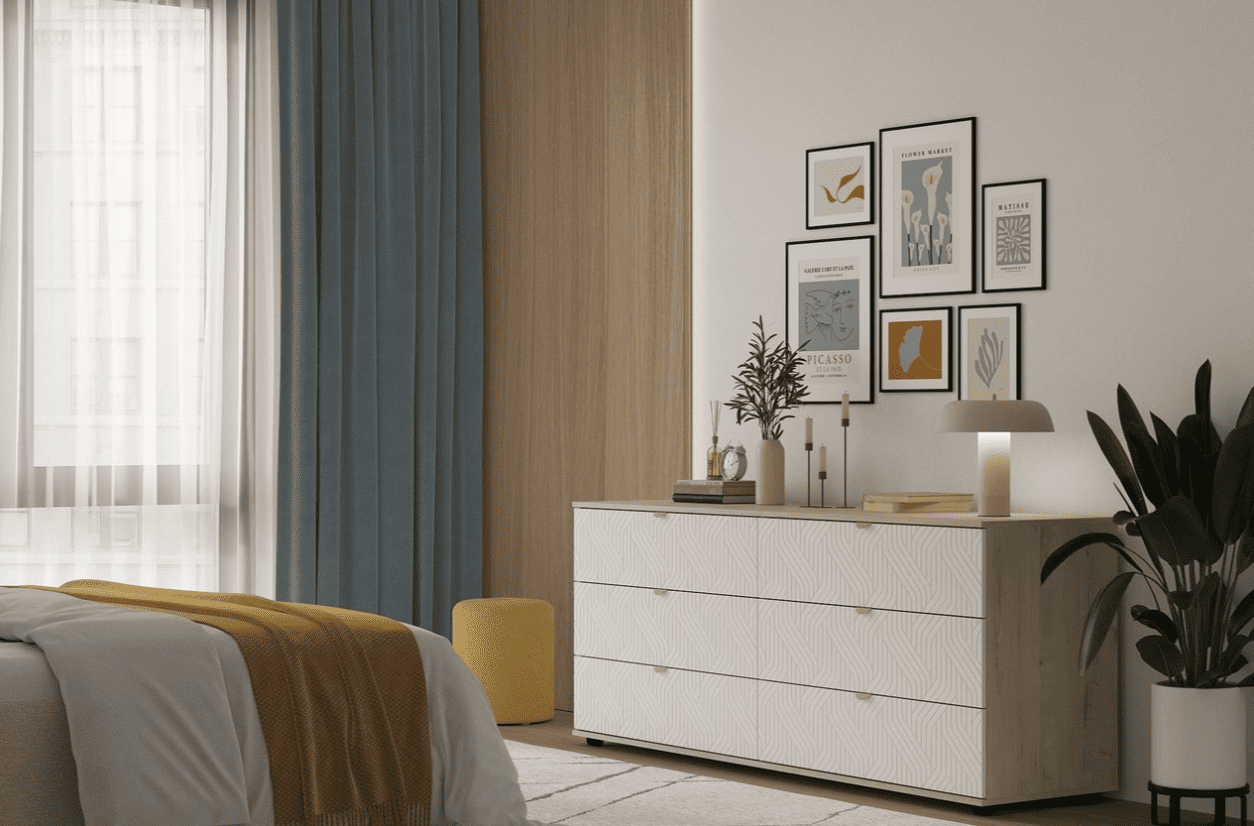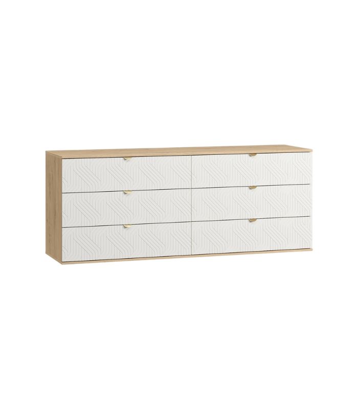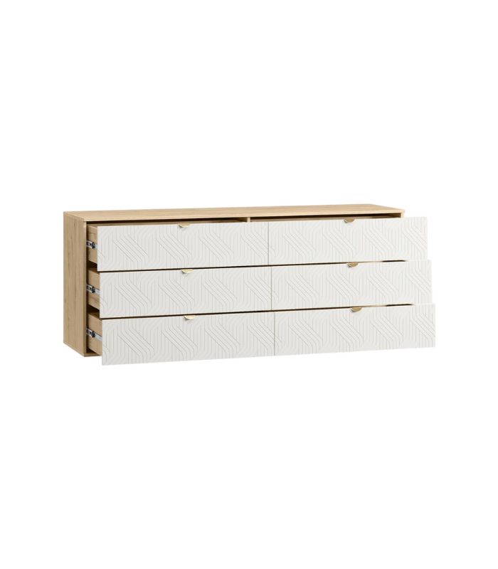Kích thước 185x50x76 phù hợp nhiều không gian như phòng ngủ, phòng khách hoặc văn phòng. Tủ được chia thành hai phần đối xứng, mỗi phần có 3 ngăn kéo rộng rãi. Các ngăn giúp phân loại đồ đạc dễ dàng, từ quần áo, phụ kiện cho đến giấy tờ. Thiết kế ray trượt chắc chắn giúp ngăn kéo vận hành nhẹ nhàng. Mặt tủ được điểm xuyết hoa văn tinh tế, tạo cảm giác sang trọng mà không cầu kỳ.