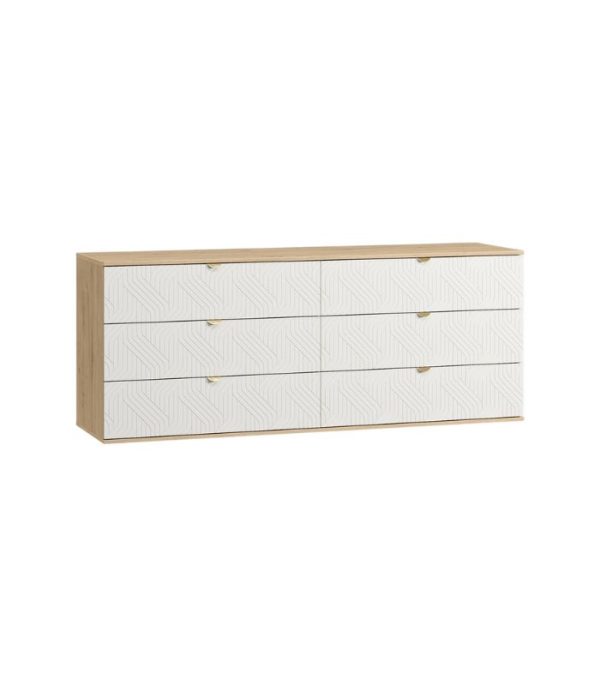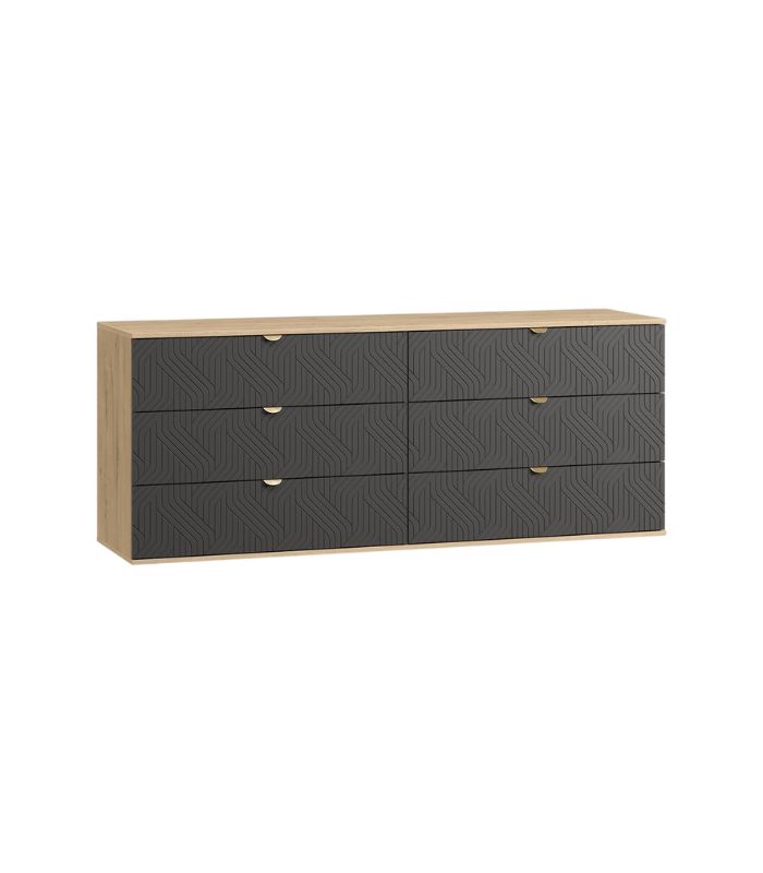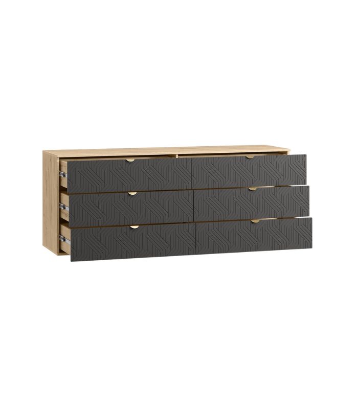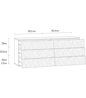 Kích thước 185x50x76 rộng rãi, tối ưu cho các không gian phòng ngủ, phòng khách hoặc phòng thay đồ. Thiết kế chia đều thành 2 bên, mỗi bên gồm 3 ngăn kéo, mang lại khả năng lưu trữ lớn. Các ngăn kéo trượt êm, giúp thao tác đóng mở nhẹ nhàng. Bố cục 6 ngăn cho phép người dùng phân loại đồ đạc khoa học hơn. Rất tiện lợi khi lưu trữ quần áo gấp gọn, phụ kiện, giấy tờ hoặc vật dụng cá nhân. Mặt ngoài được trang trí hoa văn tinh tế, tạo điểm nhấn thẩm mỹ cho tổng thể sản phẩm.