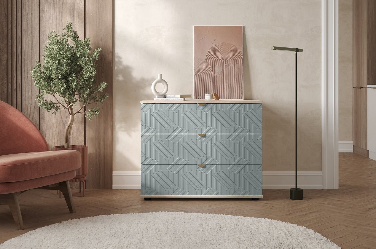 Ba ngăn kéo rộng rãi hỗ trợ lưu trữ tiện lợi, giúp không gian luôn gọn gàng. Ngăn kéo trượt mượt mà, thuận tiện cho việc sử dụng hằng ngày. Hoa văn tinh tế ở mặt ngoài tạo nên nét thanh lịch và cảm giác cao cấp hơn cho sản phẩm. Sắc xanh dương nhạt mang lại sự thư giãn, khiến tủ trở thành điểm nhấn nhẹ nhàng trong không gian. Đây là lựa chọn phù hợp cho những ai yêu thích sự tươi sáng và hiện đại trong thiết kế nội thất.