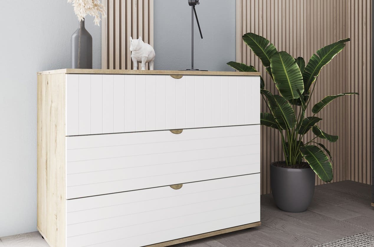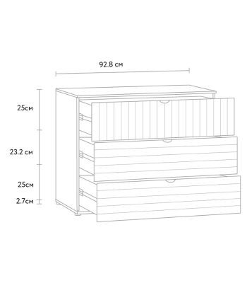 Kích thước 93x50x76 cm gọn gàng nhưng tối ưu công năng. 3 ngăn kéo riêng biệt giúp sắp xếp quần áo, phụ kiện, sách vở và vật dụng cá nhân một cách khoa học và gọn gàng. Hệ thống ray trượt chất lượng cao mang lại trải nghiệm mở đóng mượt mà và bền bỉ. Từng chi tiết từ tay nắm đến cạnh tủ được gia công tỉ mỉ, tạo cảm giác chắc chắn và thanh lịch.
