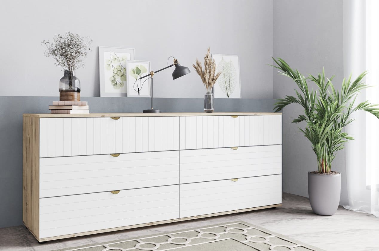 Kích thước 185x50x76 cho phép tủ đáp ứng tốt nhu cầu lưu trữ lớn cho hộ gia đình. Thiết kế 2 bên cân đối, mỗi bên 3 ngăn kéo mang lại sự tiện dụng cao. Các ngăn kéo rộng và sâu hỗ trợ sắp xếp đồ đạc gọn gàng, từ quần áo đến phụ kiện. Ray trượt vận hành mượt, giúp mở tủ thuận tiện ngay cả khi đựng nhiều vật dụng. Tổng thể gồm 6 ngăn lưu trữ giúp phân chia đồ đạc khoa học theo nhu cầu. Mặt ngoài được trang trí hoa văn Line thanh mảnh, tăng vẻ trang nhã cho sản phẩm.