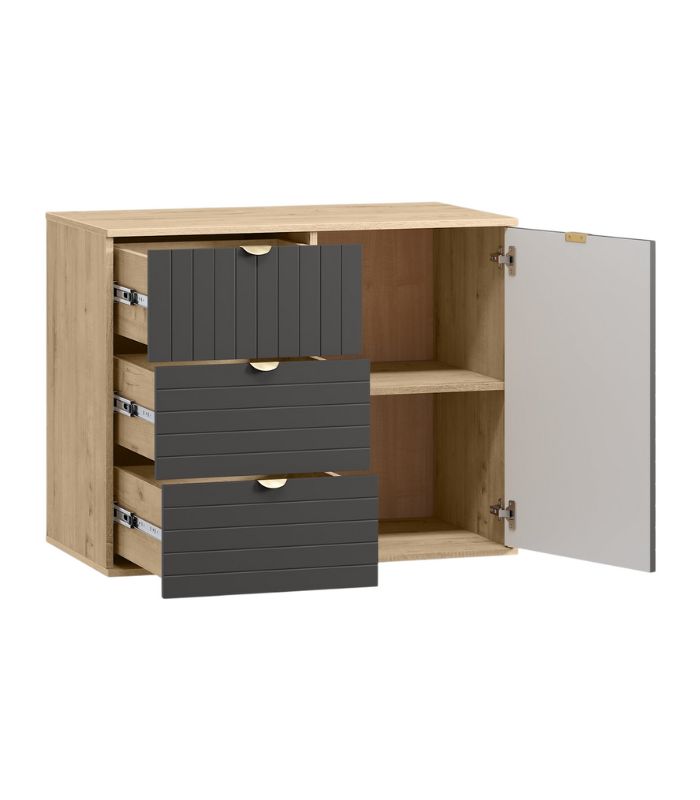 Với kích thước 93x50x76 cm, tủ gọn gàng nhưng tối ưu công năng, dễ bố trí trong phòng ngủ, phòng khách hay phòng làm việc. Thiết kế tủ chia làm 2 bên tiện dụng: bên trái gồm 3 ngăn kéo riêng biệt, bên phải là 1 cánh mở ra với 2 ngăn kệ, giúp lưu trữ quần áo, phụ kiện, sách vở hay vật dụng cá nhân một cách khoa học.