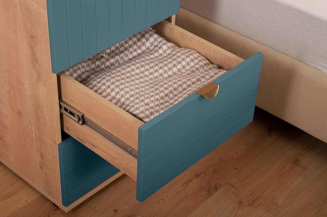 Tủ ngăn kéo Mont Blanc Line Xanh Ngọc Navy là điểm nhấn nổi bật, mang đến sự trẻ trung, sang trọng cho căn phòng. Chất liệu MDF phủ melamine chống ẩm đảm bảo độ bền lâu dài, hạn chế cong vênh. Cánh tủ sơn PU một mặt bóng mịn, chống trầy xước và dễ vệ sinh.