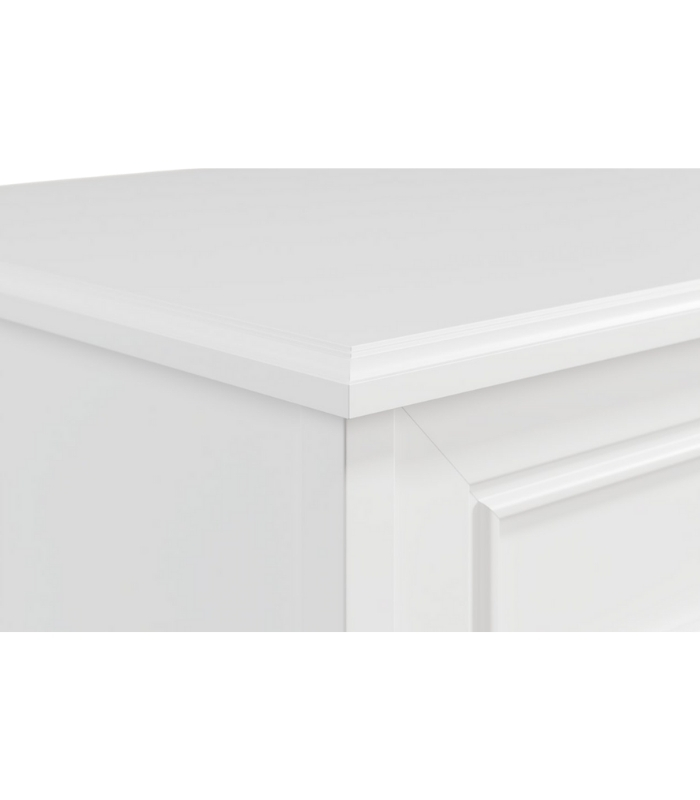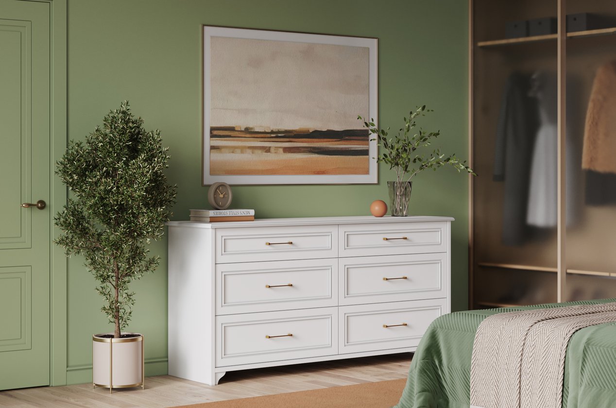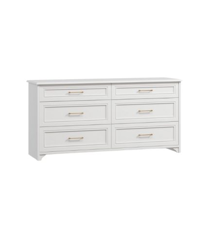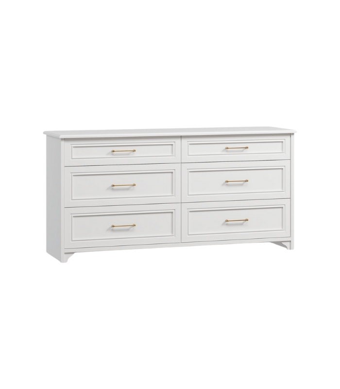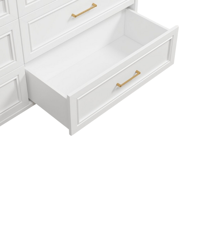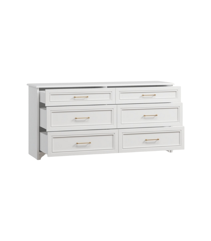Mẫu tủ sở hữu kích thước lớn 182x50x90cm, gồm 3 tầng ngăn kéo bên trái và 3 tầng ngăn kéo bên phải, mang đến khả năng lưu trữ vượt trội cho phòng ngủ hoặc phòng thay đồ. Tông trắng chủ đạo mang đến vẻ thanh lịch, tạo cảm giác rộng rãi và tinh khôi cho không gian.