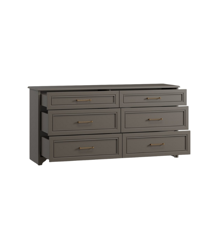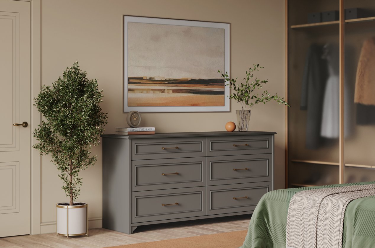 Với thiết kế gấp đôi kích thước của phiên bản Monteo – 1, mẫu tủ sở hữu 6 ngăn kéo chia đều hai bên, cực kỳ phù hợp để sắp xếp quần áo, phụ kiện hoặc vật dụng cá nhân trong không gian phòng ngủ hoặc phòng thay đồ rộng rãi. Sắc Xám Chì tạo cảm giác chiều sâu, giúp căn phòng trở nên thanh lịch và đậm tính thẩm mỹ.