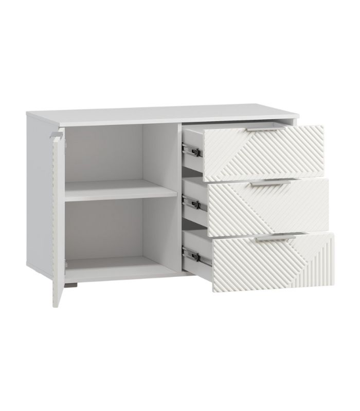 Thiết kế tủ được chia làm hai phần tiện dụng: bên trái là cửa 1 cánh, bên trong bố trí các ngăn kệ gọn gàng để cất chăn mỏng, khăn, hộp đựng đồ hoặc phụ kiện nhỏ. Bên phải là 3 ngăn kéo, phù hợp để sắp xếp trang phục gấp, giấy tờ, đồ dùng cá nhân một cách ngay ngắn và khoa học. Gam Trắng tinh khôi mang lại cảm giác rộng rãi, sạch sẽ và đặc biệt dễ phối hợp với mọi phong cách nội thất.