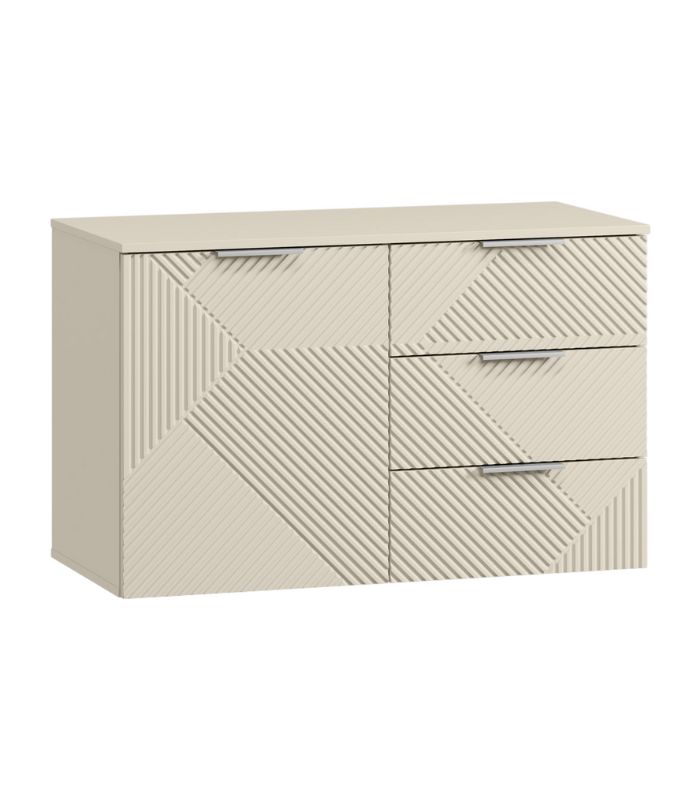 Thiết kế tủ gồm bên trái là cửa 1 cánh, bên trong bố trí các ngăn kệ tiện dụng để lưu trữ nhiều loại vật dụng khác nhau. Bên phải là 3 ngăn kéo, phù hợp với quần áo gấp, hồ sơ, phụ kiện hoặc đồ dùng cá nhân. Gam Trắng Kem là tông màu trung tính, sang nhưng không lạnh, dễ phối với các chất liệu gỗ, nệm, rèm hoặc tổng thể phòng ngủ. Dáng tủ hiện đại, vuông vức, đường nét tinh giản tạo cảm giác nhẹ nhàng và sạch sẽ.