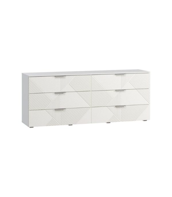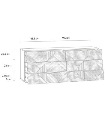 Thiết kế gồm hai cụm ngăn kéo, mỗi bên 3 ngăn, tạo nên bố cục cân đối và tiện nghi. Kích thước 183x42x73cm mang lại không gian lưu trữ lớn nhưng vẫn giữ được dáng tủ gọn và thanh lịch.