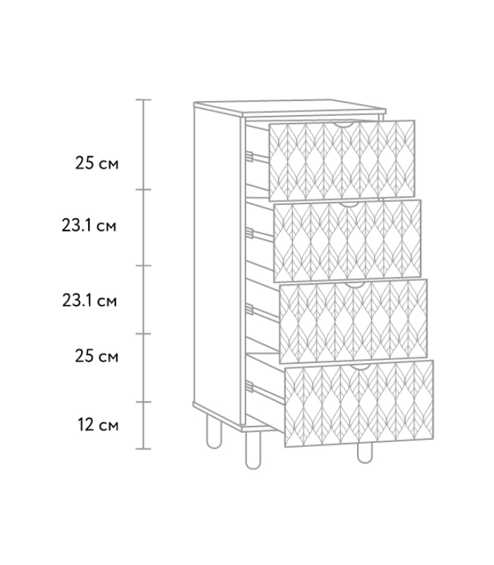 Bố cục 4 ngăn kéo giúp bạn dễ dàng sắp xếp vật dụng cá nhân gọn gàng, trong khi tay nắm vàng ánh kim và chân gỗ tròn cao tạo nên nét tinh tế và thanh thoát cho tổng thể thiết kế. Kiểu dáng vuông vức, tỷ lệ cân đối giúp tủ phù hợp với nhiều không gian — từ phòng ngủ đến phòng khách.