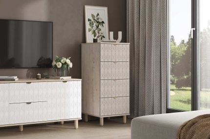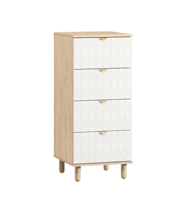 Bố cục 4 ngăn kéo giúp bạn dễ dàng sắp xếp vật dụng cá nhân gọn gàng, trong khi tay nắm vàng ánh kim và chân gỗ tròn cao tạo nên nét tinh tế và thanh thoát cho tổng thể thiết kế. Kiểu dáng vuông vức, tỷ lệ cân đối giúp tủ phù hợp với nhiều không gian — từ phòng ngủ đến phòng khách.