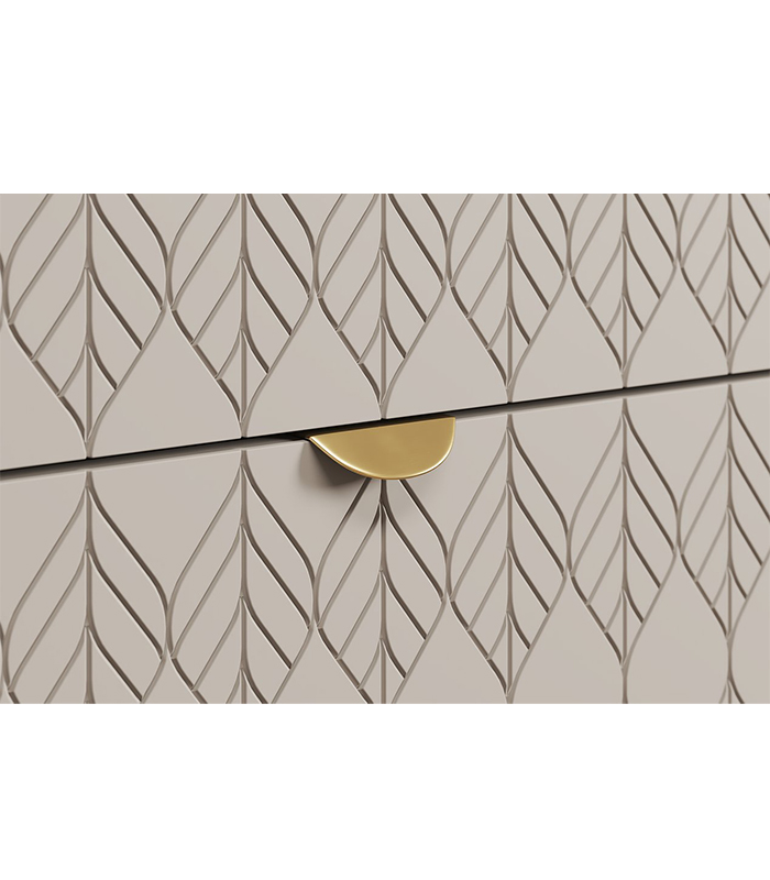 Sản phẩm được chế tác từ gỗ MDF chống ẩm dày 17mm phủ melamine, kết hợp cánh sơn PU 1 mặt hoàn thiện tông cà phê sữa cùng hiệu ứng lá nhẹ đặc trưng. Cấu trúc chắc chắn, mép cạnh được dán tinh xảo bằng máy móc hiện đại, giúp tủ bền bỉ và duy trì vẻ đẹp trong thời gian dài.