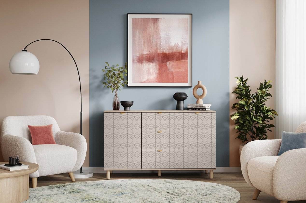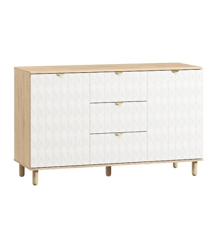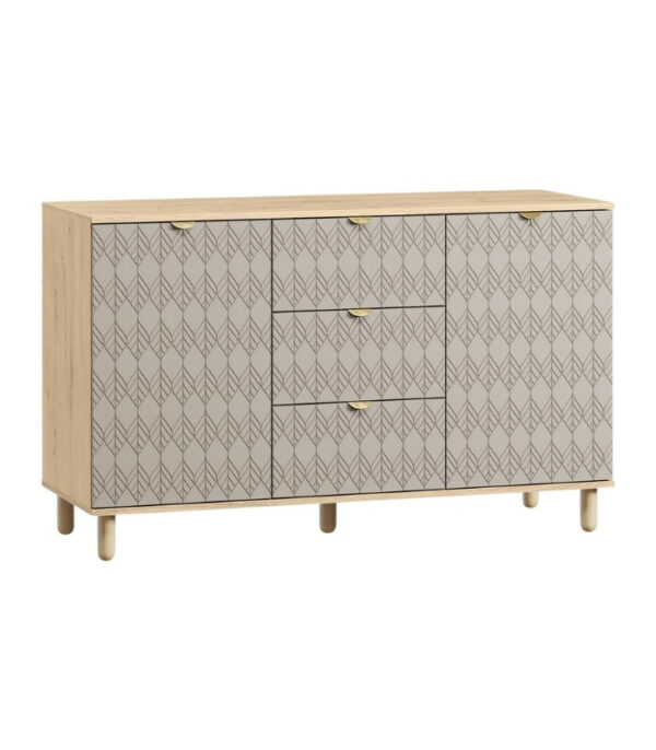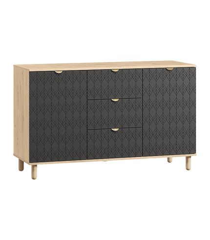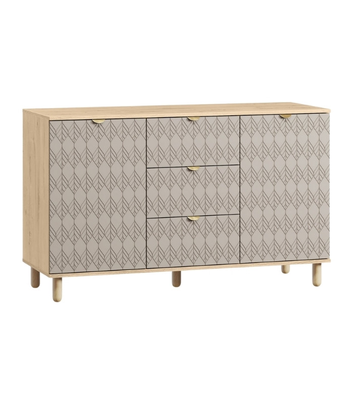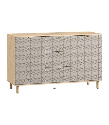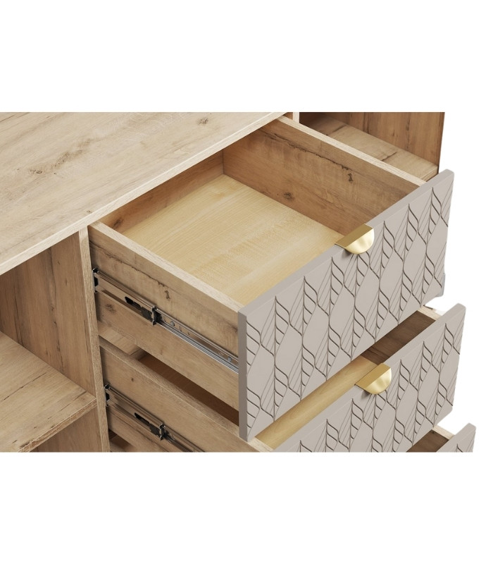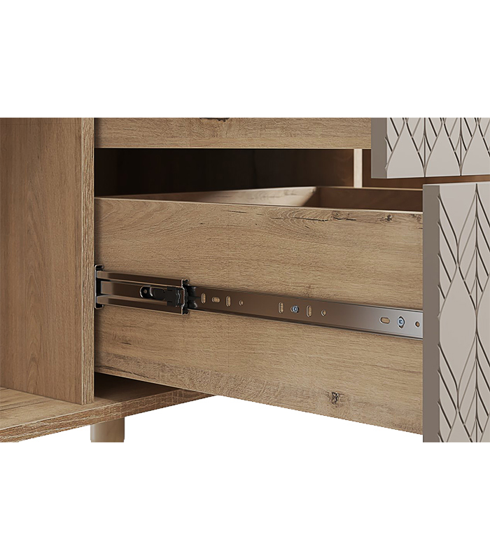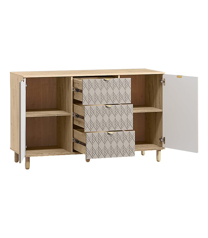 Tủ được thiết kế thông minh với hai cánh mở ở hai bên, bên trong là các ngăn để đồ tiện dụng, cùng ba hộc kéo trung tâm giúp phân loại vật dụng khoa học. Kiểu dáng cân đối, sáu chân gỗ tròn nâng đỡ chắc chắn đồng thời tạo cảm giác thanh thoát cho tổng thể.