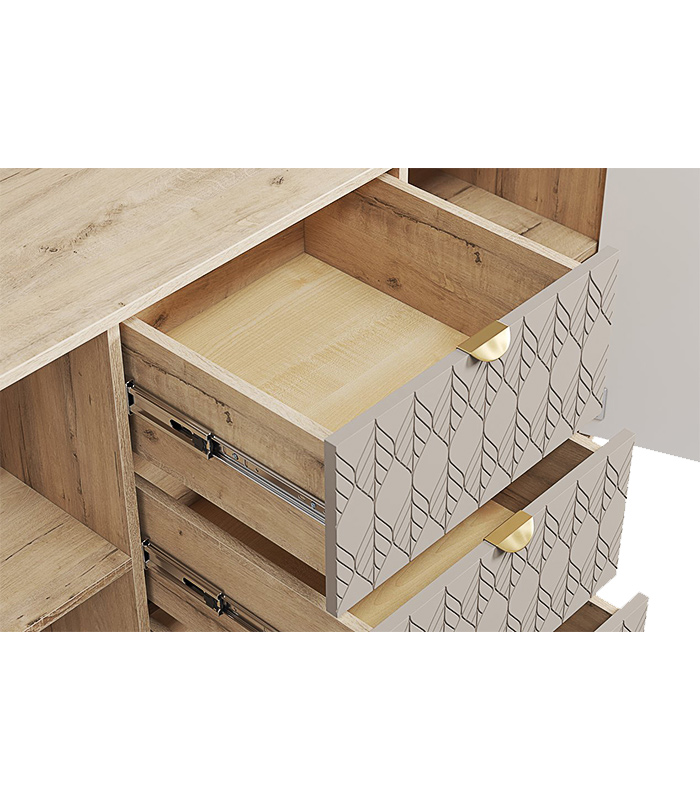 Mang sắc ấm áp và dễ chịu, Tủ Ngăn Kéo Tedjons – 2 Cà Phê Sữa là điểm nhấn nhẹ nhàng cho không gian nội thất. Màu nâu sáng tự nhiên gợi cảm giác thư thái, gần gũi nhưng vẫn giữ được nét sang trọng nhờ chi tiết tay nắm vàng ánh kim nổi bật.