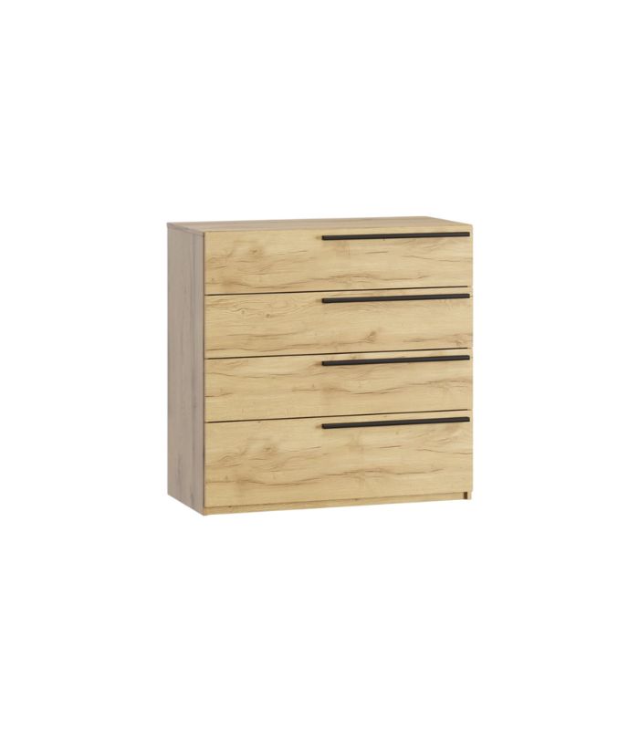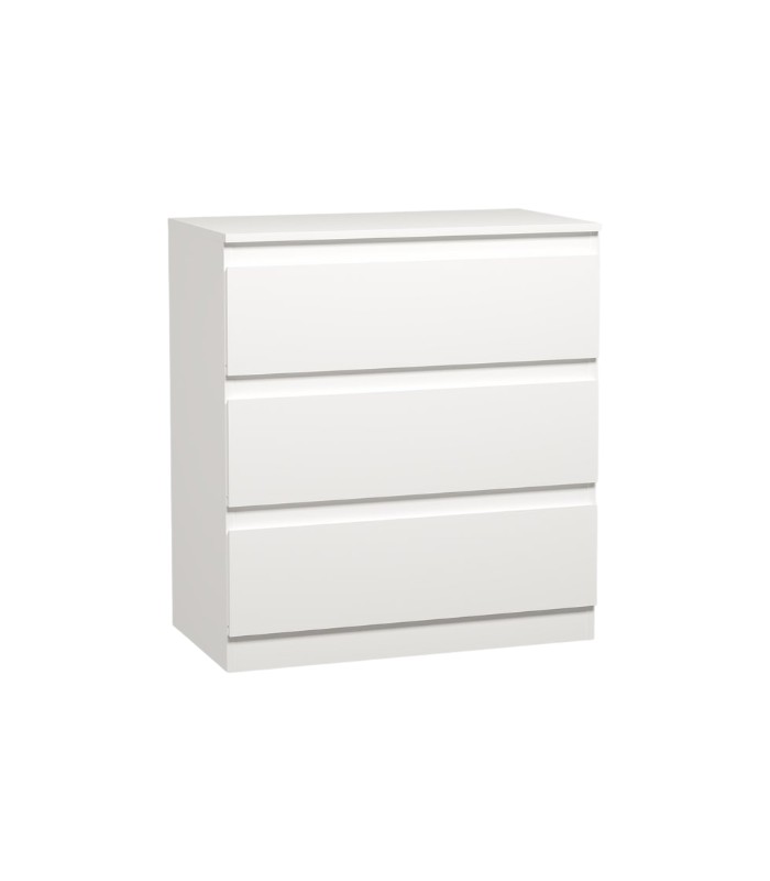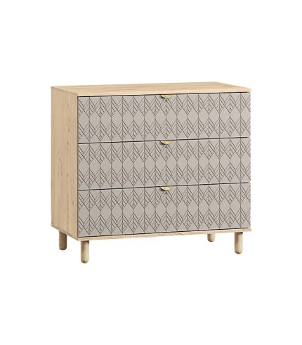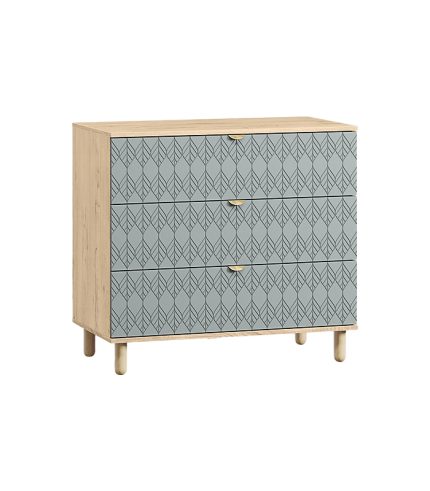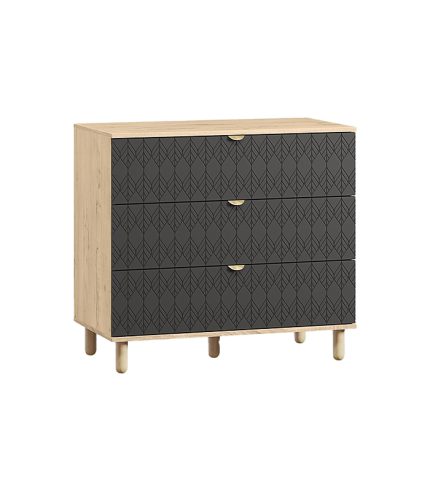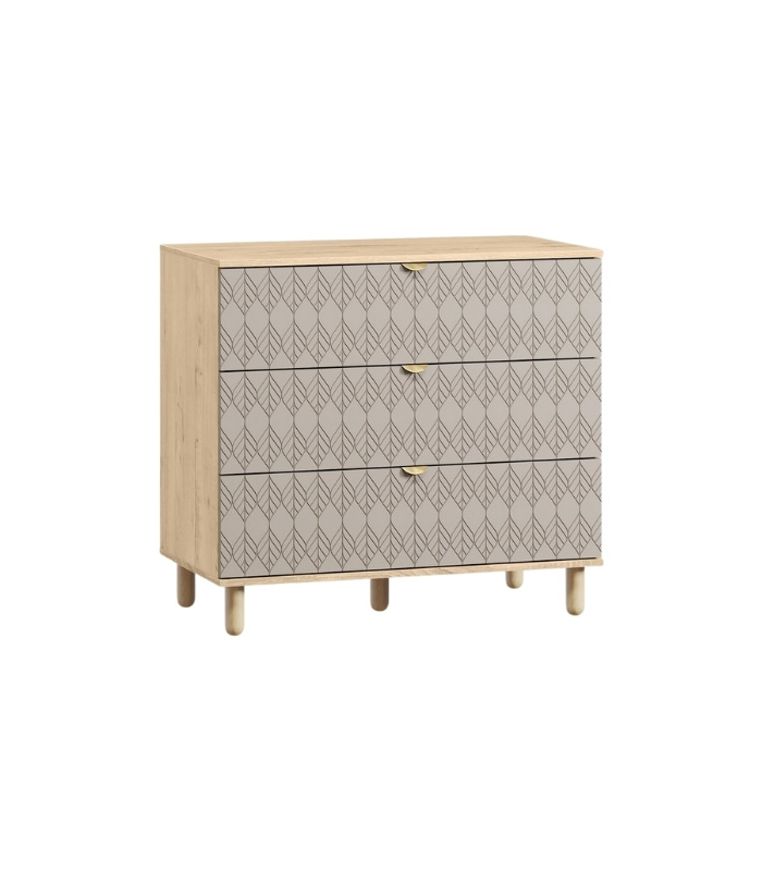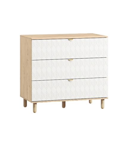 Với ba ngăn kéo lớn tiện dụng, tủ đáp ứng nhu cầu lưu trữ đa dạng, từ quần áo, phụ kiện đến vật dụng trang trí. Năm chân gỗ tròn giúp tủ đứng vững và tăng độ bền, đồng thời tạo khoảng cách thông thoáng với sàn để tránh ẩm mốc. Tay nắm vàng đồng nổi bật, tạo điểm nhấn sang trọng và khác biệt.