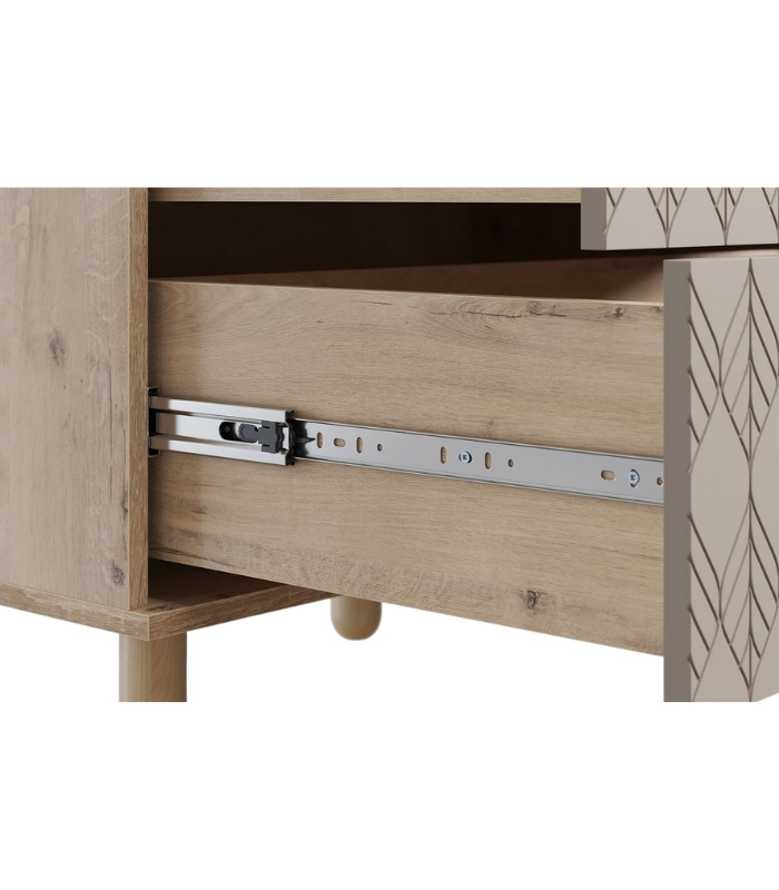 Tủ được chế tác từ ván MDF dày 17mm phủ melamine chống ẩm, kết hợp cánh sơn PU hoàn thiện một mặt với họa tiết lá mềm mại. Bề mặt sơn mịn, đều màu và có độ bóng nhẹ giúp dễ lau chùi, hạn chế trầy xước trong quá trình sử dụng.
