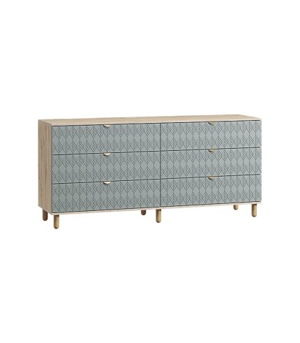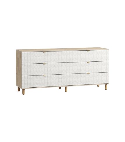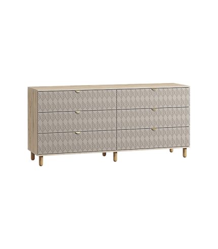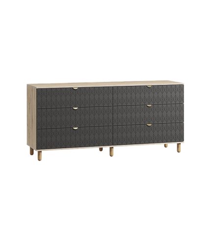 Tủ được chia làm hai phần đối xứng với tổng cộng sáu ngăn kéo, mang lại không gian lưu trữ rộng rãi và tiện lợi. Sáu chân gỗ tròn được gia công chắc chắn, giúp tủ đứng vững và dễ dàng vệ sinh bên dưới. Tay nắm vàng ánh kim tô điểm thêm nét hiện đại, giúp tổng thể trở nên hài hòa và sang trọng.
