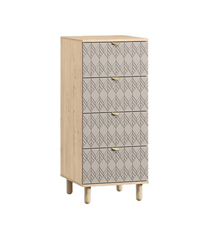 Tủ được chia thành 4 ngăn kéo rộng rãi, cho phép sắp xếp vật dụng ngăn nắp mà vẫn đảm bảo tính thẩm mỹ. Phần tay nắm kim loại vàng tinh tế tạo điểm nhấn nổi bật trên nền trắng, mang lại cảm giác sang trọng nhưng không phô trương.