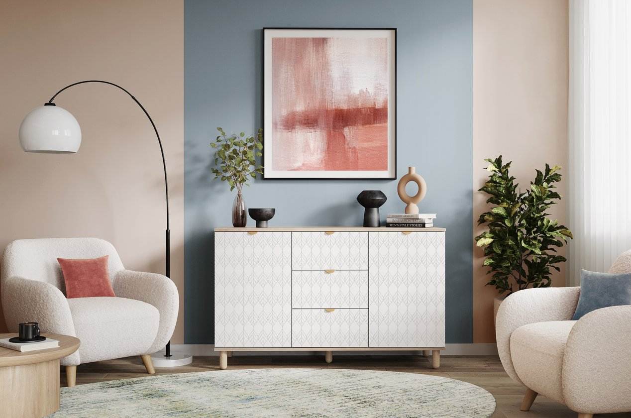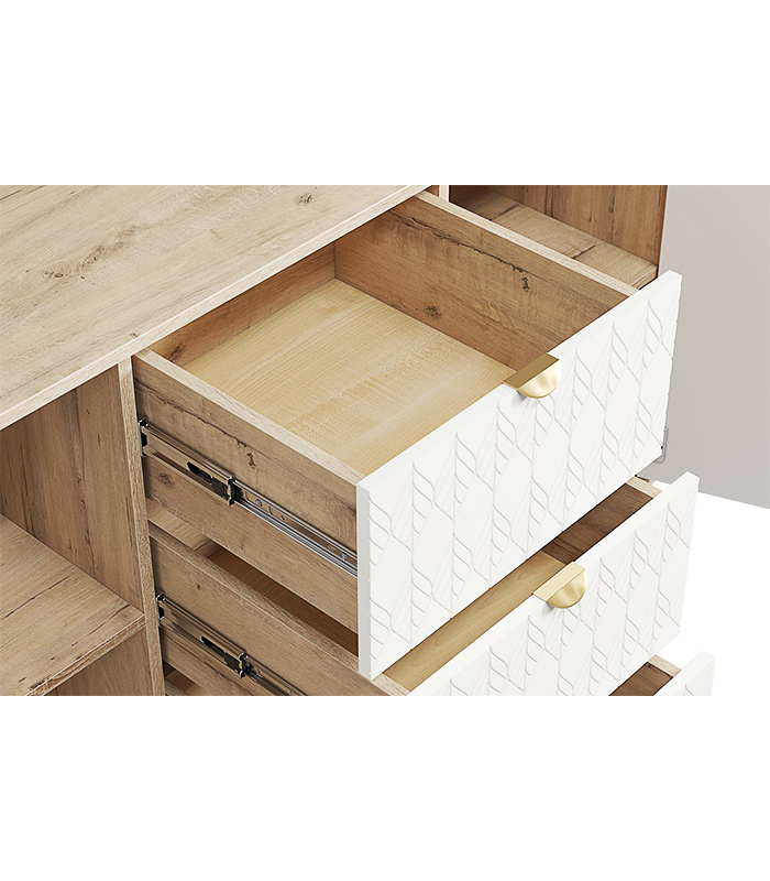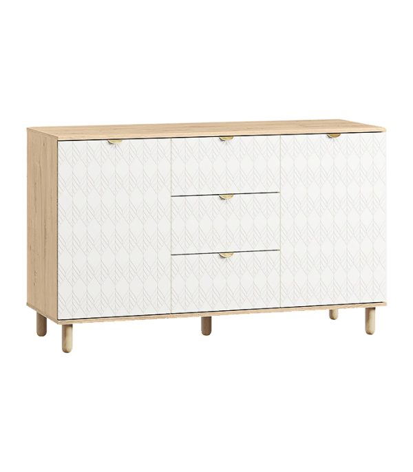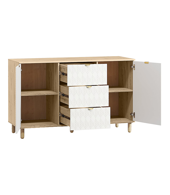 Với thiết kế ba phần cân đối, tủ có hai cánh mở ở hai bên và ba hộc kéo ở giữa, giúp người dùng dễ dàng sắp xếp vật dụng theo nhu cầu. Sáu chân gỗ tròn chắc chắn vừa đảm bảo độ vững vừa giúp tổng thể trông nhẹ nhàng, thanh thoát.
