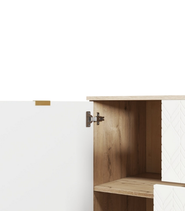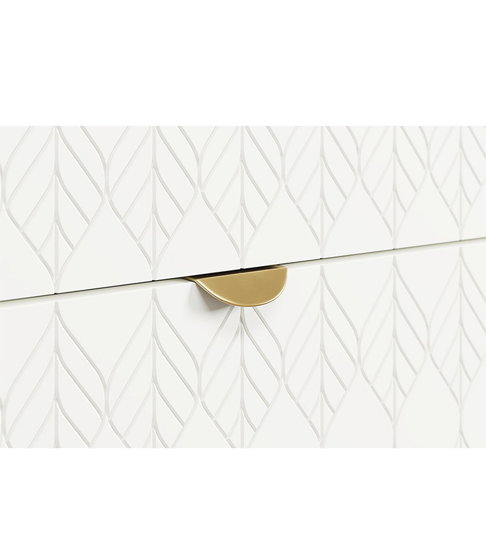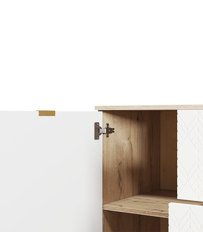 Sản phẩm được chế tác từ gỗ MDF dày 17mm phủ melamine chống ẩm, kết hợp cánh sơn PU trắng mịn màng với họa tiết lá đặc trưng. Nhờ quy trình gia công cẩn thận, từng chi tiết được lắp ghép chặt chẽ, bề mặt được xử lý phẳng mịn, giúp tủ không chỉ bền mà còn có tính thẩm mỹ cao.