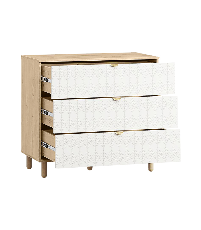 Với thiết kế ba ngăn kéo lớn, tủ cung cấp không gian lưu trữ linh hoạt và tiện dụng. Năm chân gỗ tròn tạo thế cân đối, giúp tủ đứng vững nhưng vẫn giữ được dáng vẻ thanh thoát, phù hợp với nhiều kiểu sàn khác nhau. Mặt cánh được sơn PU trắng mịn, nổi bật với họa tiết lá mềm mại – đặc trưng của bộ Tedjons, tạo nên nét duyên dáng và khác biệt.