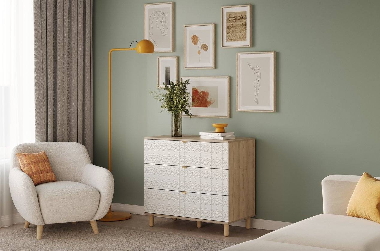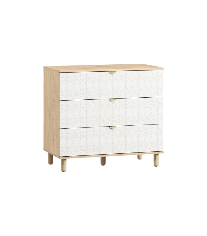 Tủ Ngăn Kéo Tedjons – 3 Trắng đem đến cảm giác thanh lịch và tinh khiết cho không gian sống. Tông trắng chủ đạo kết hợp cùng tay nắm vàng ánh kim mang lại vẻ sang trọng nhưng không kém phần nhẹ nhàng, phù hợp cho phòng ngủ, phòng làm việc hay góc sinh hoạt chung.