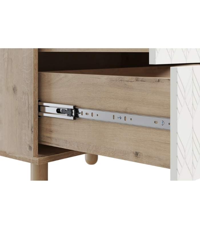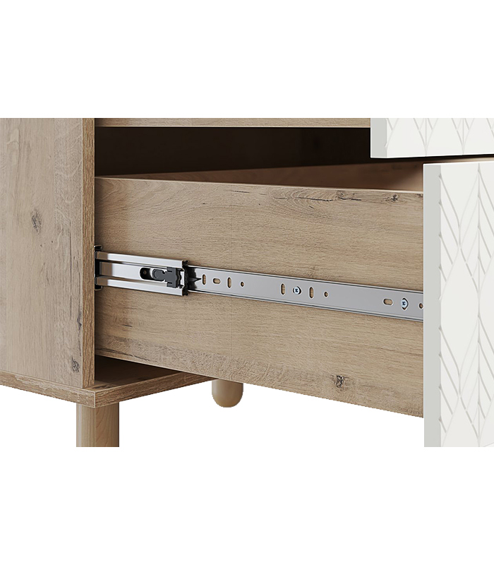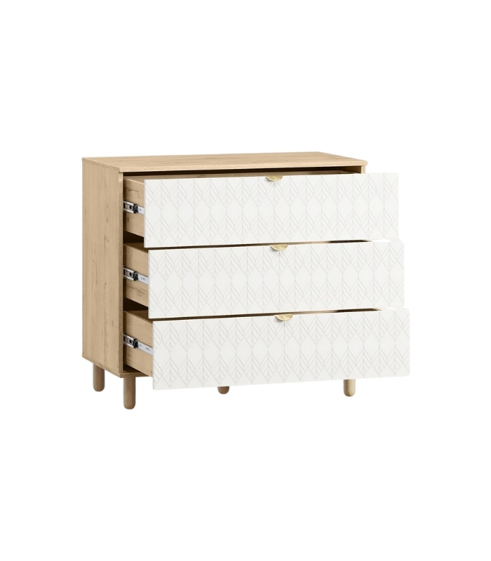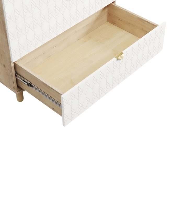 Với thiết kế ba ngăn kéo lớn, tủ cung cấp không gian lưu trữ linh hoạt và tiện dụng. Năm chân gỗ tròn tạo thế cân đối, giúp tủ đứng vững nhưng vẫn giữ được dáng vẻ thanh thoát, phù hợp với nhiều kiểu sàn khác nhau. Mặt cánh được sơn PU trắng mịn, nổi bật với họa tiết lá mềm mại – đặc trưng của bộ Tedjons, tạo nên nét duyên dáng và khác biệt.
