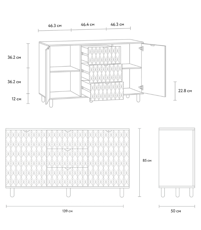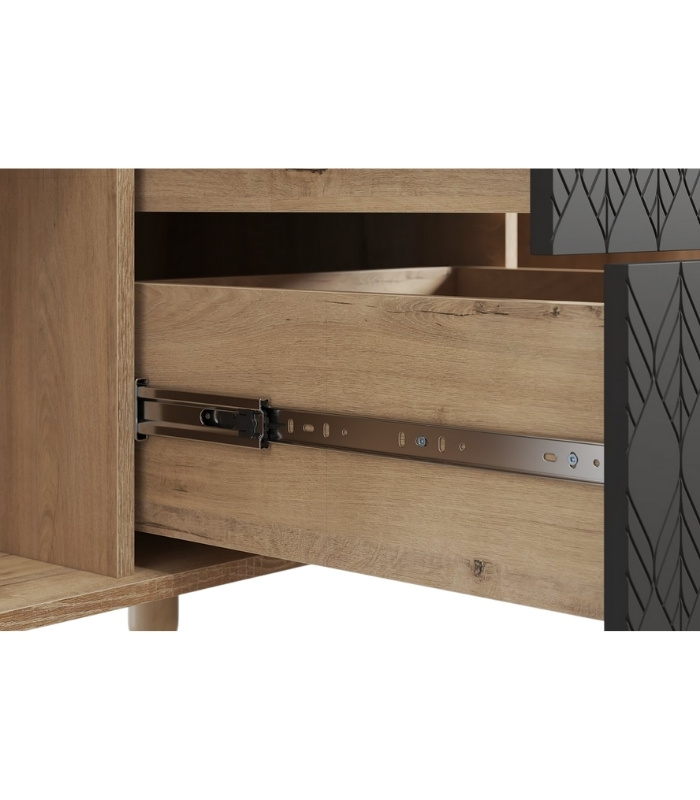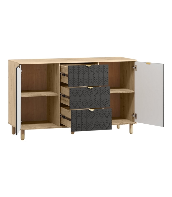 Tủ được chia thành ba phần rõ rệt: hai bên là cánh mở có ngăn trong, ở giữa là ba hộc kéo giúp tối ưu không gian lưu trữ. Thiết kế này không chỉ tiện dụng mà còn mang lại sự cân bằng thị giác, giúp sản phẩm trông vững chãi và hài hòa. Sáu chân gỗ tròn nâng đỡ toàn bộ khung tủ, tạo cảm giác thanh thoát và dễ dàng vệ sinh phía dưới.