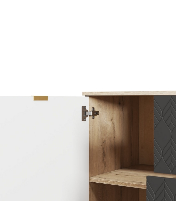 Phụ kiện như bản lề và ray kéo đều đến từ thương hiệu uy tín, đảm bảo độ êm và cảm giác chắc tay khi sử dụng. Tủ có thể đặt ở phòng khách, phòng ngủ hoặc hành lang, đóng vai trò vừa là tủ lưu trữ vừa là món décor trang nhã.