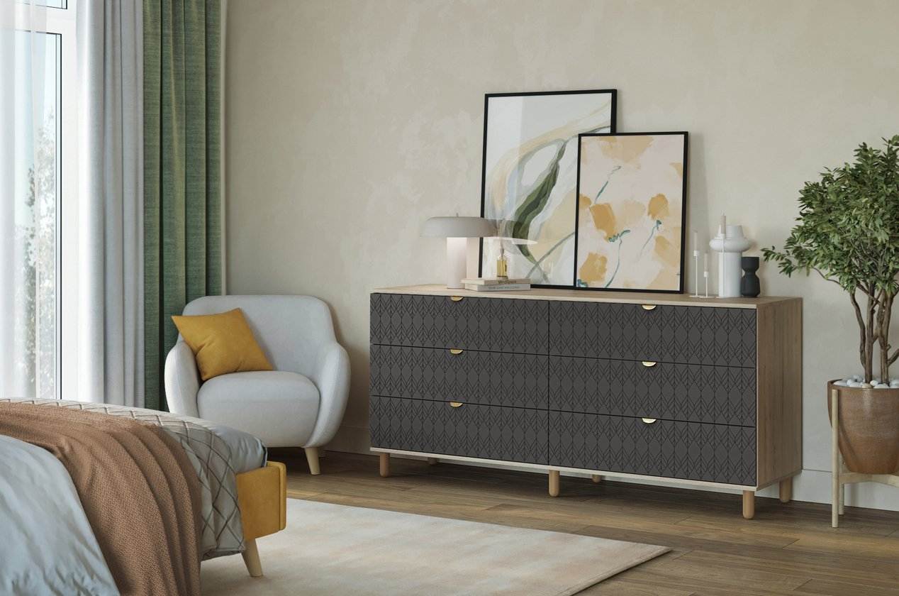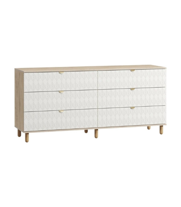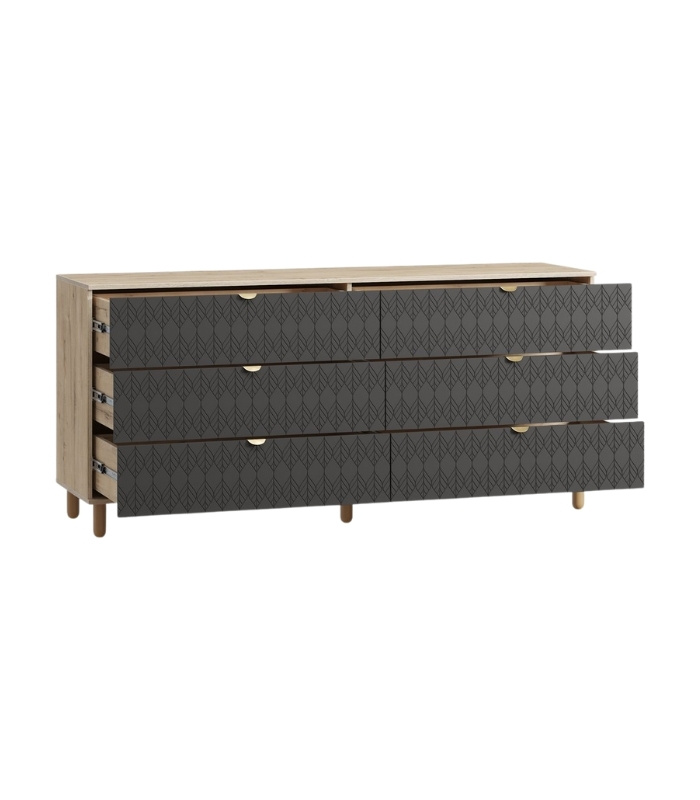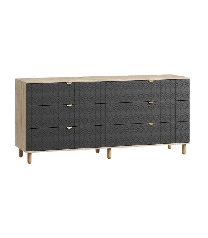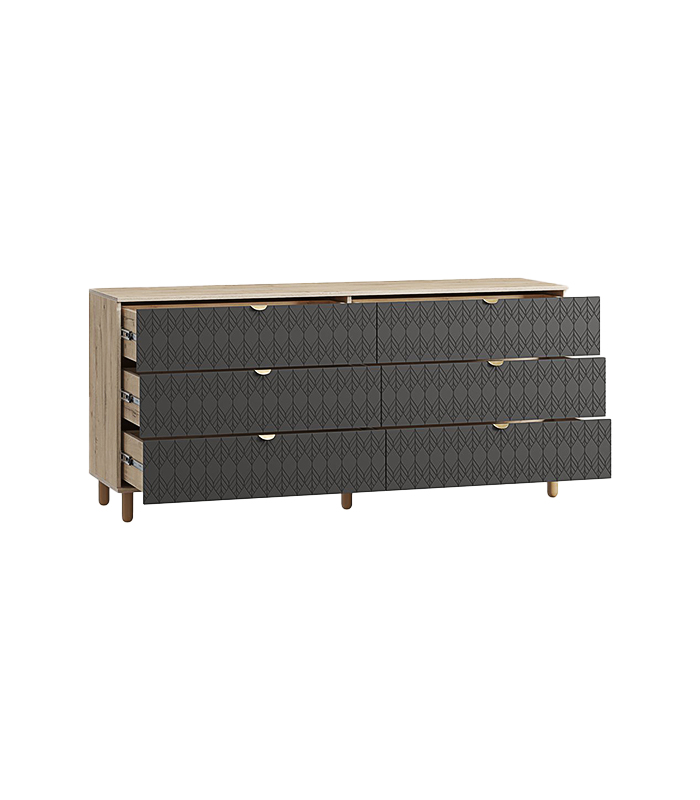 Tủ gồm sáu ngăn kéo lớn, chia đều hai bên tạo bố cục đối xứng, mang đến cảm giác hài hòa và tiện dụng. Sáu chân gỗ tròn đỡ toàn bộ thân tủ, giúp kết cấu chắc chắn, đồng thời tạo khoảng hở với sàn để dễ dàng vệ sinh. Tay nắm vàng ánh kim nổi bật trên nền xám, tạo điểm nhấn sang trọng và cá tính.