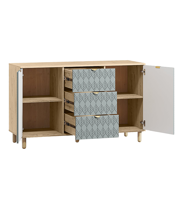 Tủ được thiết kế gồm ba khu vực lưu trữ riêng biệt, hai bên là cánh mở có hai ngăn bên trong, còn trung tâm là ba hộc kéo giúp người dùng dễ dàng phân loại và sắp xếp đồ đạc. Sáu chân gỗ tròn tạo dáng đứng thanh mảnh, đồng thời giúp tủ cách ẩm hiệu quả với sàn nhà.