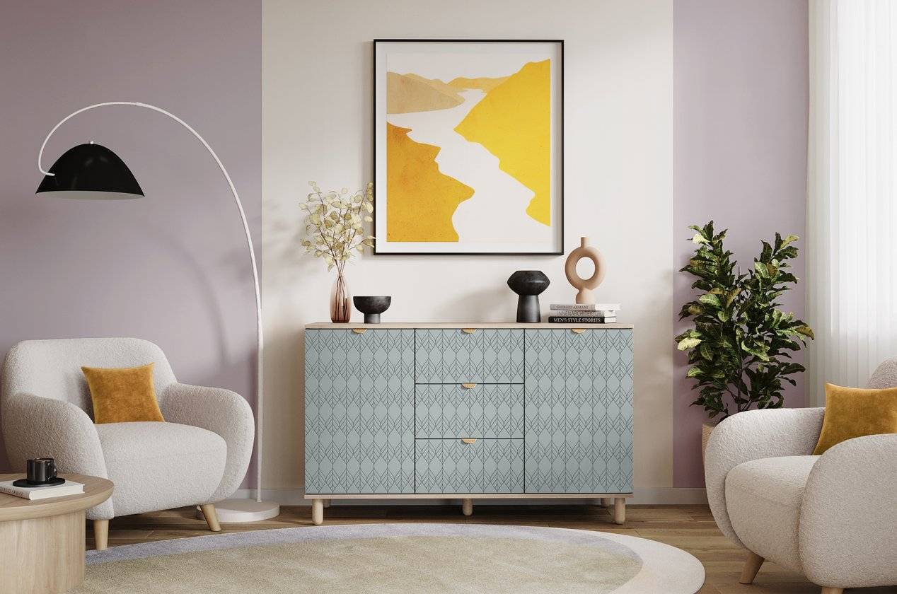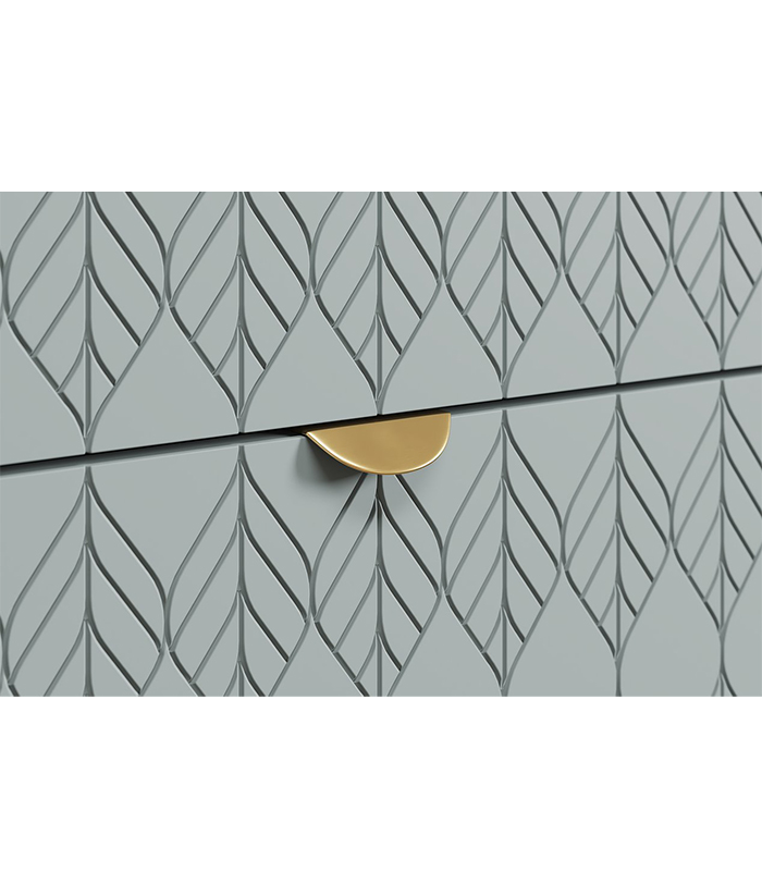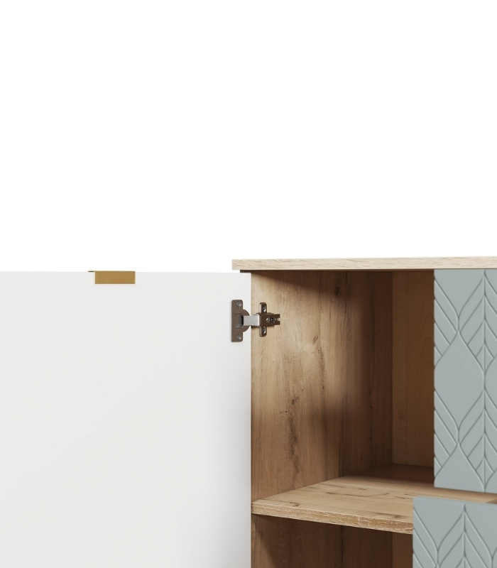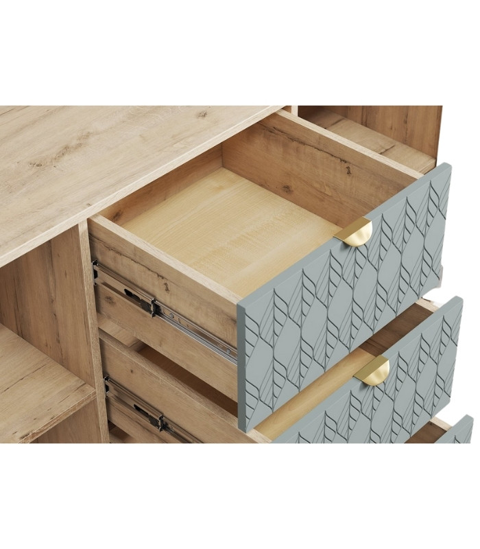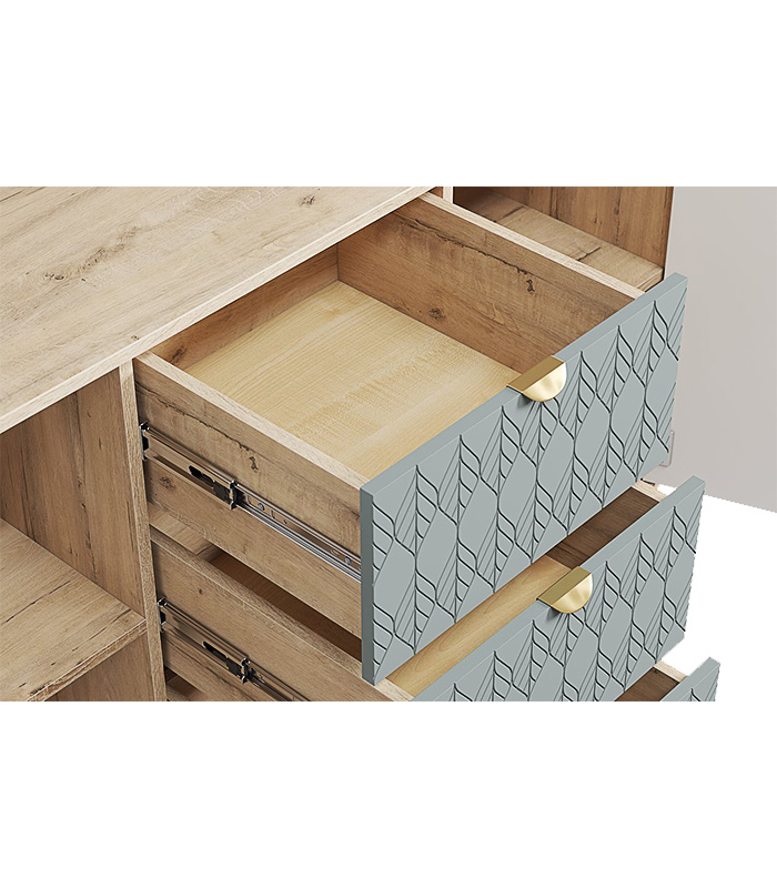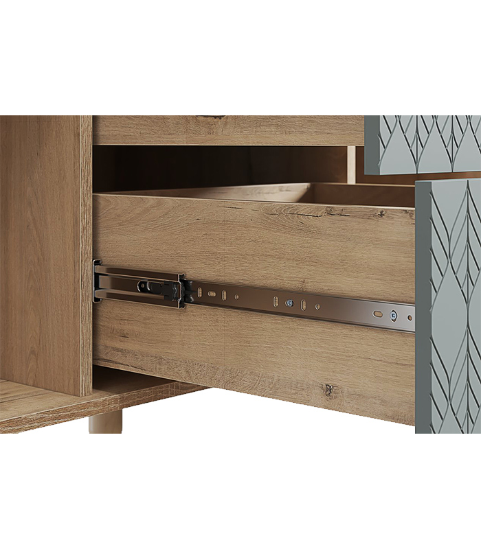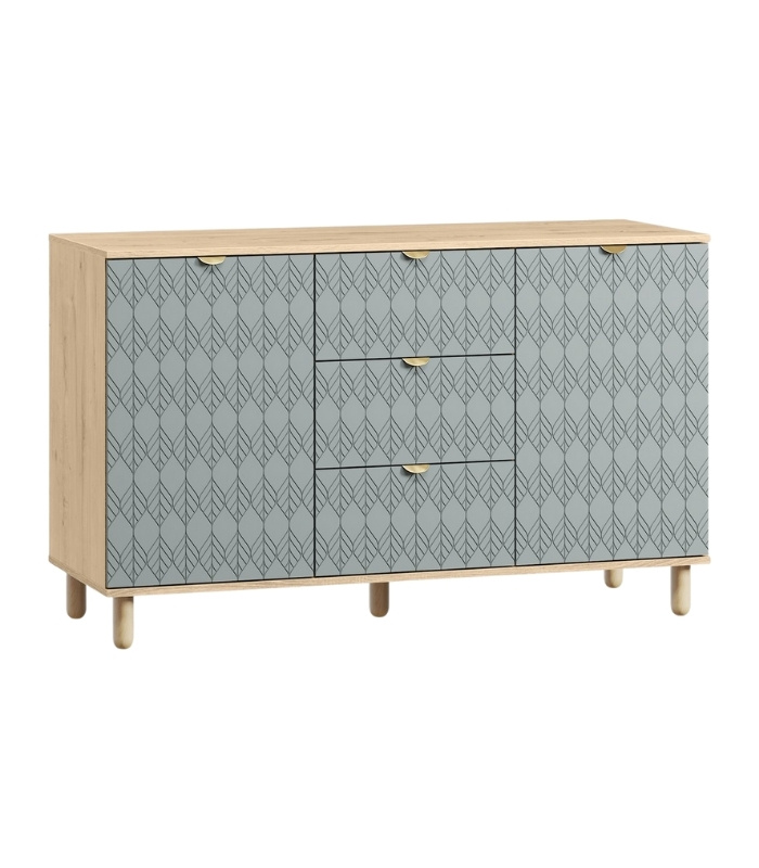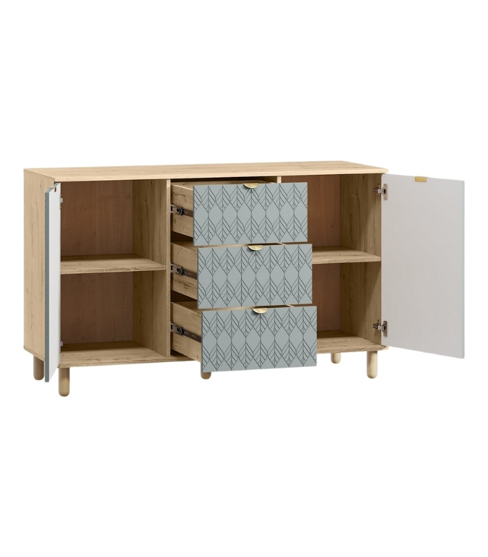 Tủ được thiết kế gồm ba khu vực lưu trữ riêng biệt, hai bên là cánh mở có hai ngăn bên trong, còn trung tâm là ba hộc kéo giúp người dùng dễ dàng phân loại và sắp xếp đồ đạc. Sáu chân gỗ tròn tạo dáng đứng thanh mảnh, đồng thời giúp tủ cách ẩm hiệu quả với sàn nhà.