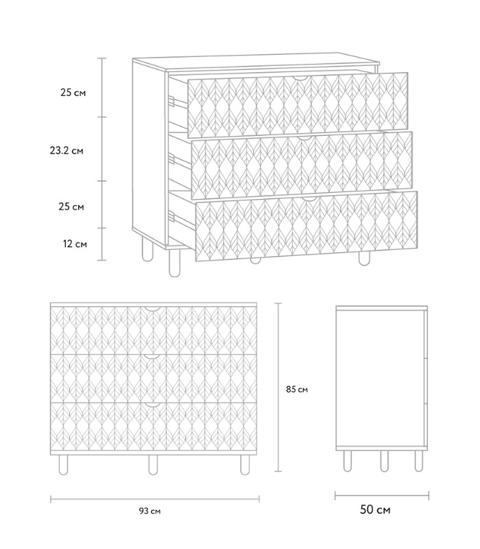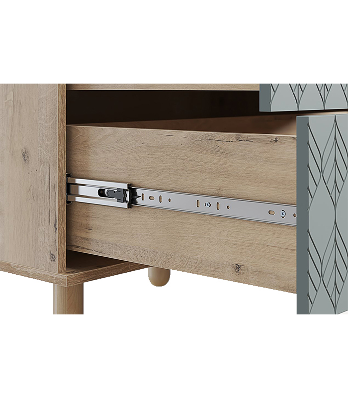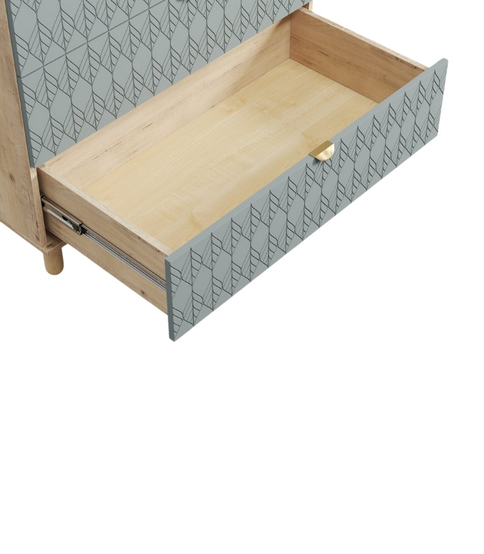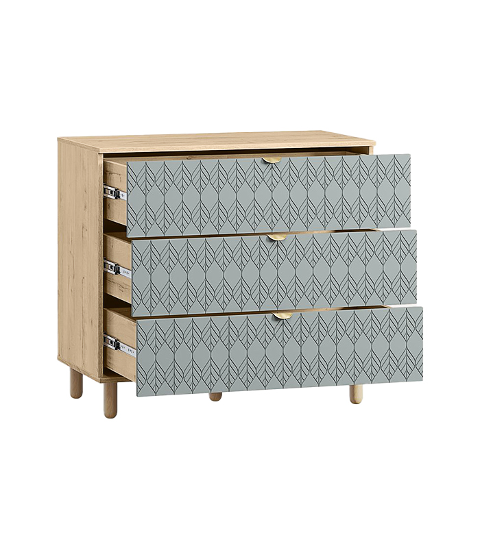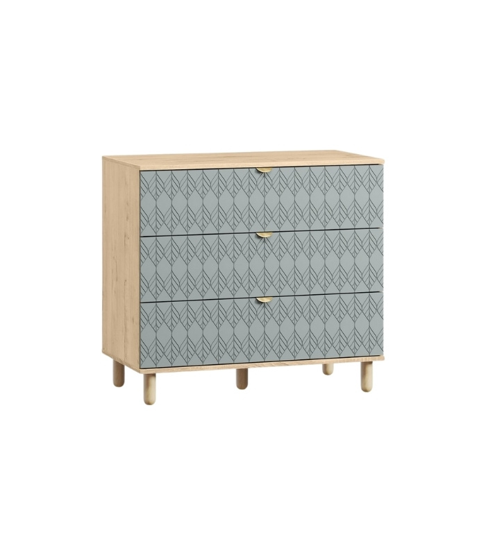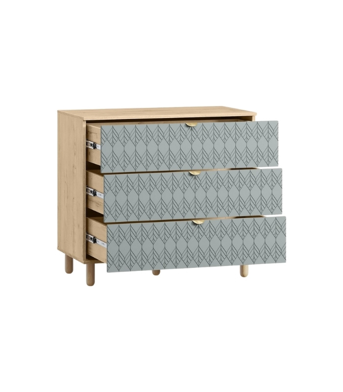 Tủ được thiết kế với ba ngăn kéo lớn giúp sắp xếp đồ đạc một cách ngăn nắp và tiện dụng. Năm chân gỗ tròn không chỉ tạo sự vững chãi mà còn giúp dễ dàng vệ sinh bên dưới. Tay nắm kim loại ánh vàng nổi bật trên nền xanh, mang đến điểm nhấn tinh tế và sang trọng.