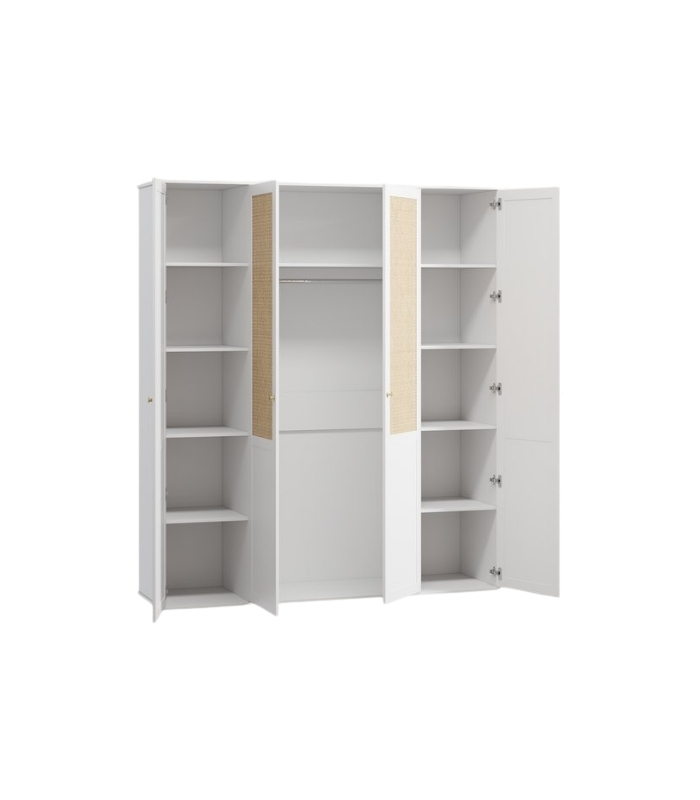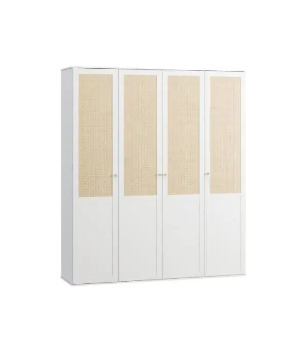 Tủ Quần Áo Alvis Trắng – 4 là phiên bản lớn nhất trong dòng tủ Alvis, mang đến không gian lưu trữ rộng rãi và bố cục khoa học cho phòng ngủ hiện đại. Thiết kế bốn cánh đối xứng với gam trắng thanh lịch, kết hợp chi tiết mây sơn nhẹ nhàng tạo nên vẻ ngoài hài hòa, tinh tế và dễ dàng phối hợp với nhiều phong cách nội thất khác nhau.